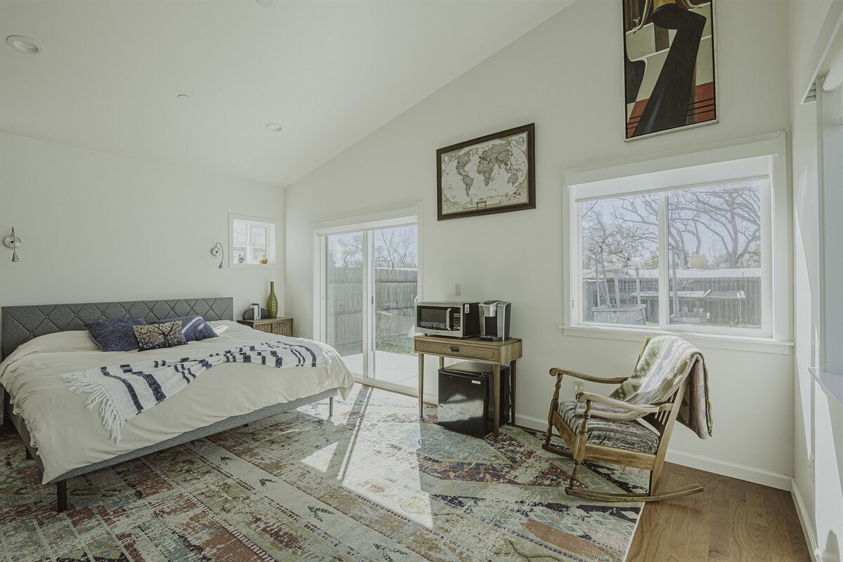 The Eagle's Nest is a spacious and charming one bedroom fully remodeled studio with a king bed, full bathroom, living room, kitchenette and laundry.