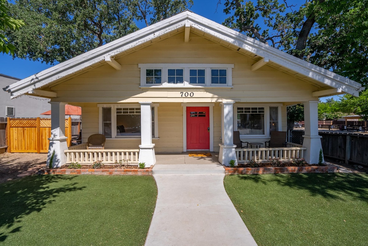 Main Street is the place to be! Historic home built in 1915 features original wood floors, doors, and woodwork, yet with everything else fresh and modern for comfort and pleasure. Two bedrooms, two bathrooms, full kitchen and laundry, and the best porch in town! Walk to wine tasting, dining, shops or sit and rock as the lazy afternoon rolls by. Bring home your wine tasting treasures and relax and sip. Interior comfort is featured, as well, with all new appliances and furnishings, including a sleeper sofa, creating comfortable overnight occupancy for six guests. Enjoy the stunning enlarged photos of a local historic ranch. Newly fenced side yard for privacy, outdoor dining and BBQ. Or walk across the street for a Grassfed burger and more! Explore the town of Templeton, wine country of the Central Coast, and end your day on your own front porch! County Permit # 6010528