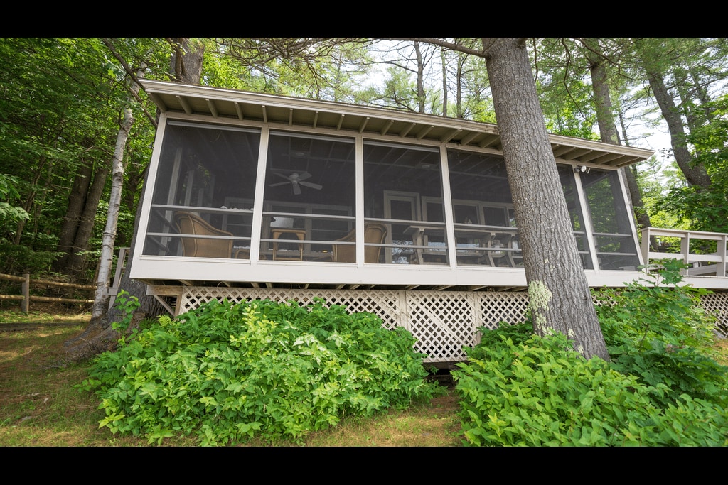 The screen porch is a highlight of the property, offering comfortable seating and the unique feature of a pine tree growing through the room. It's the perfect spot to enjoy the lake view without worrying about insects. The porch connects to a large outdoor deck with a dining table for eight, a grill for summer meals, and an outdoor shower for convenience.