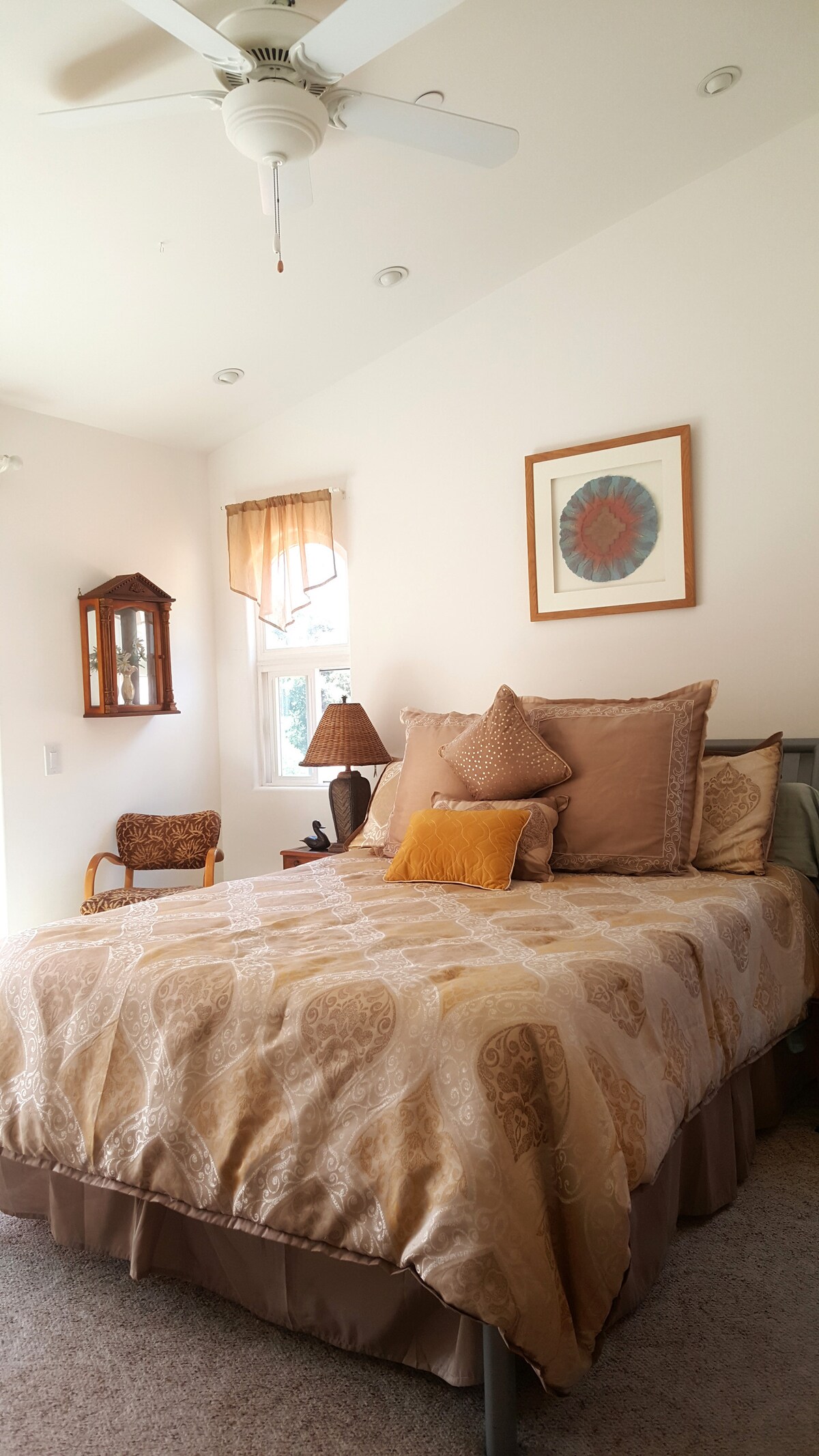 Topanga's sun and warm light accentuates these two lovingly decorated bedrooms with original art works from our collection. Guests enjoy one bedroom with queen-size bed of luxurious memory foam mattress and a second bedroom with a full-size quality Sealy pillow-top mattress; large fully furnished private patio; and bathroom with extra-large shower, double sinks and skylight. One room includes a 39" HD television and DVD player with choice of hundreds of films from our library, and a mini fridge, wine glasses and bottle opener for your favorite bottle of wine. Coffee and tea service is presented each morning. A stunning and comfortable get-away in the quiet beauty of the canyon!