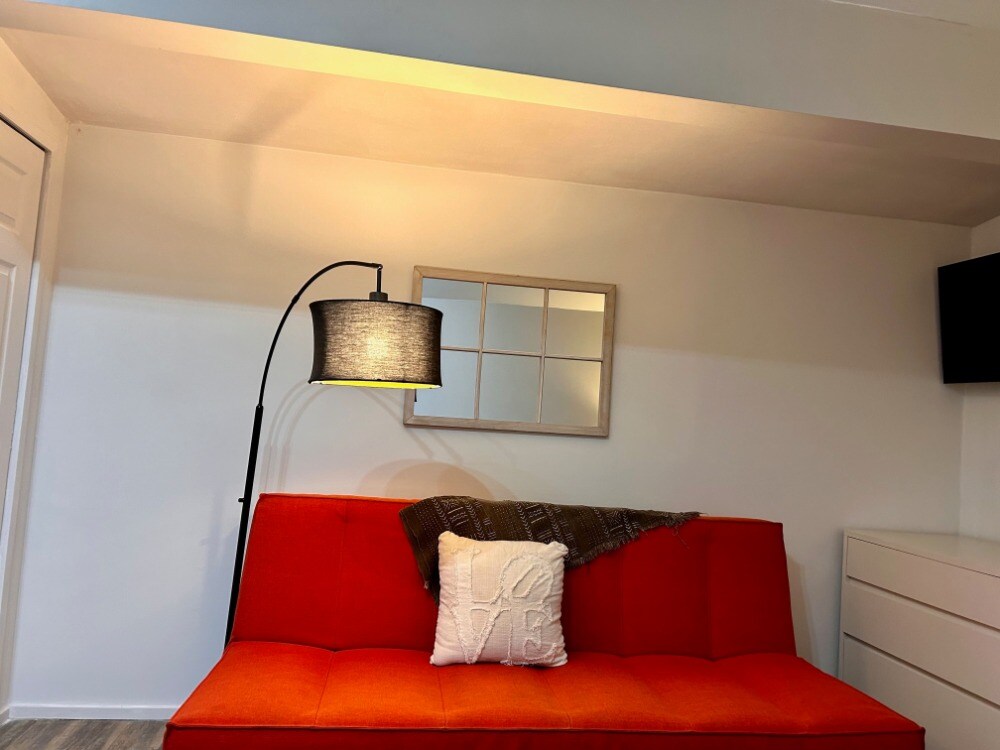 The dining /living room has an oversized table, TV ( streaming only) sleeping sofa with memory foam mattress and skylights ( daylight is not blocked)