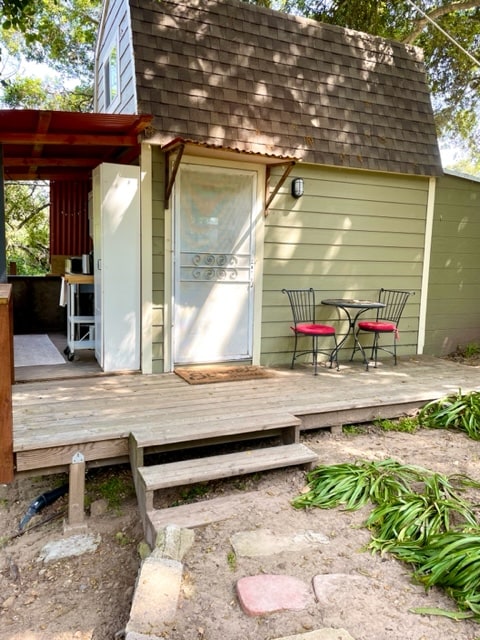 The Farmhouse is a guesthouse further down in the garden at the bottom of the property and detached from the main house. The guesthouse has its own separate patio and deck space which is private to this room, but visible from The Zen Den's space. The clawfoot tub is around the corner of the Farmhouse and provides more privacy as it is not visible from the rest of the yard.