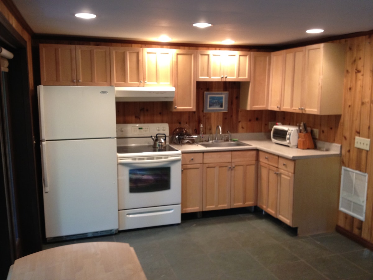 Kitchen has a full size fridge, microwave, 4 burner stove and oven, pots and pans and utensils. Everything you need to cook a good meal.