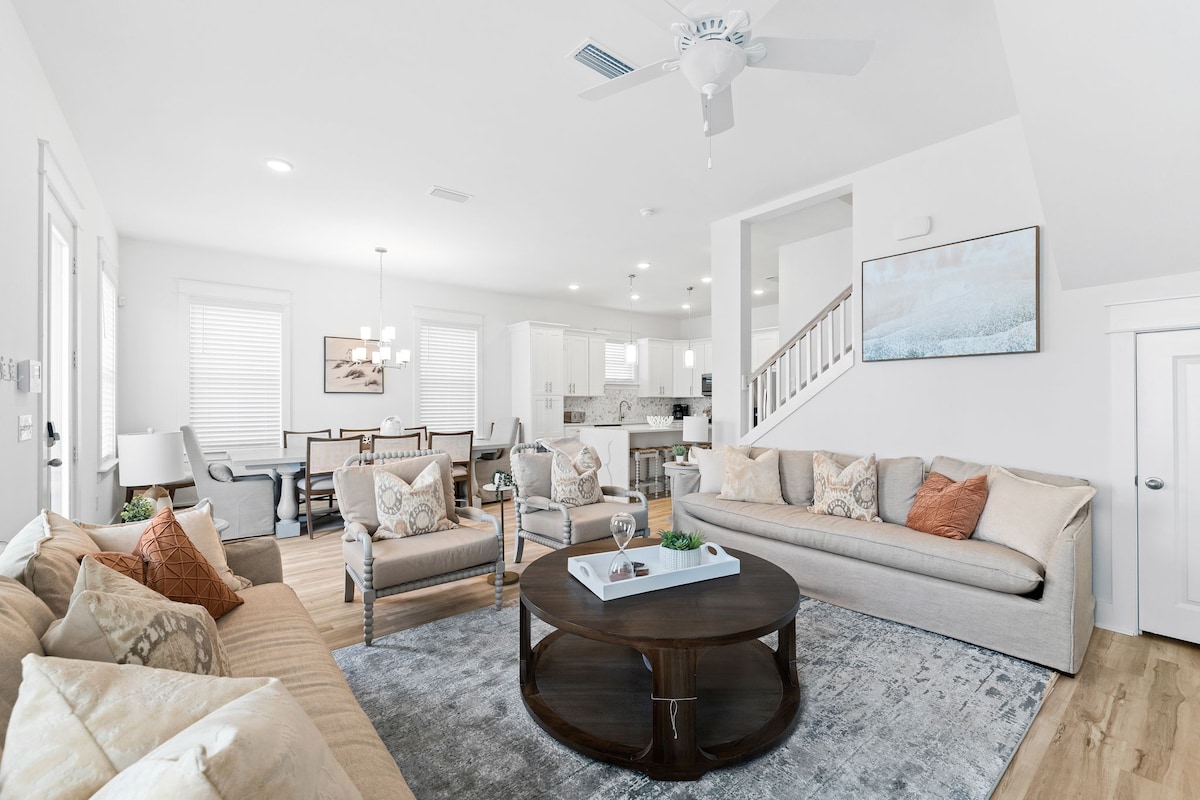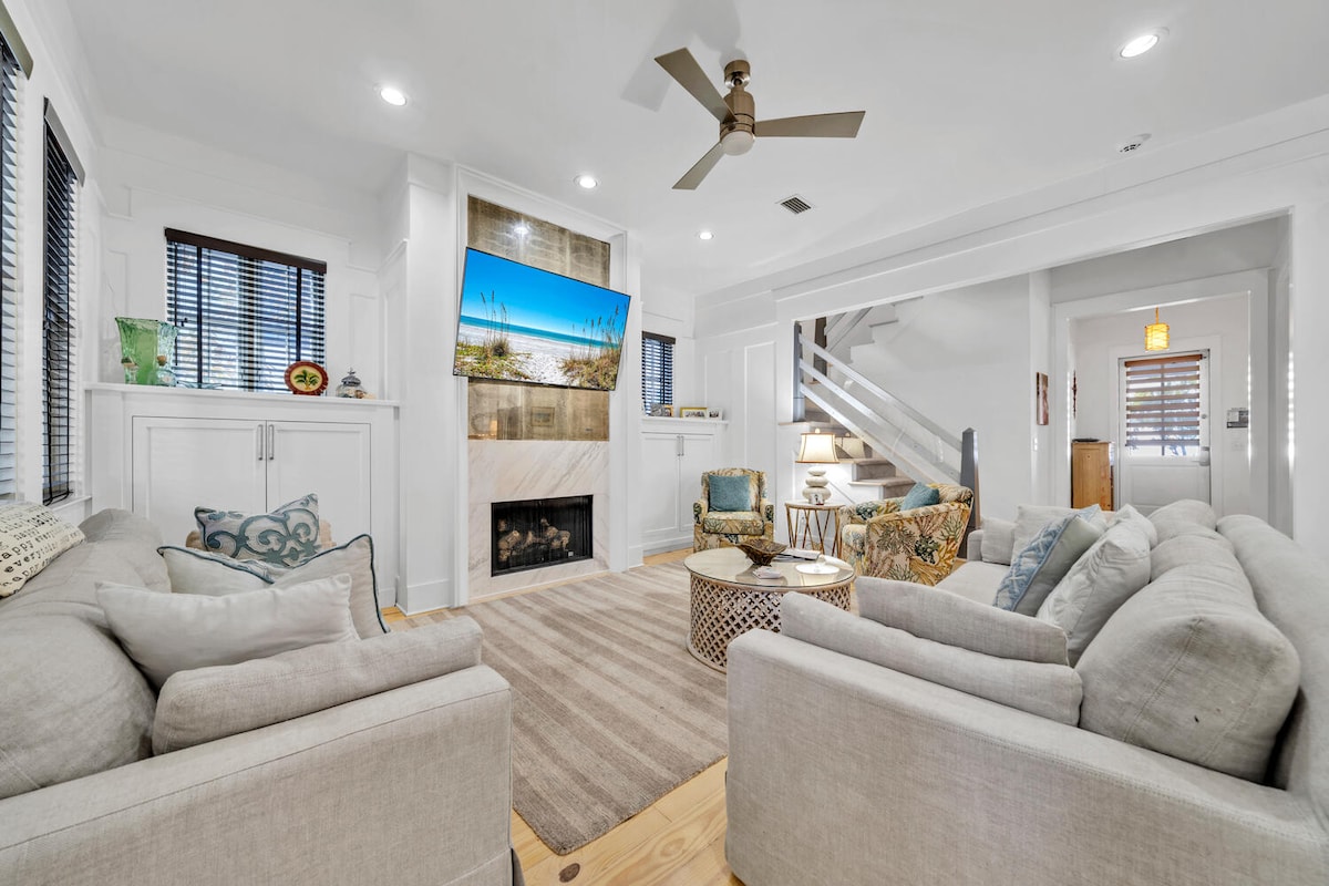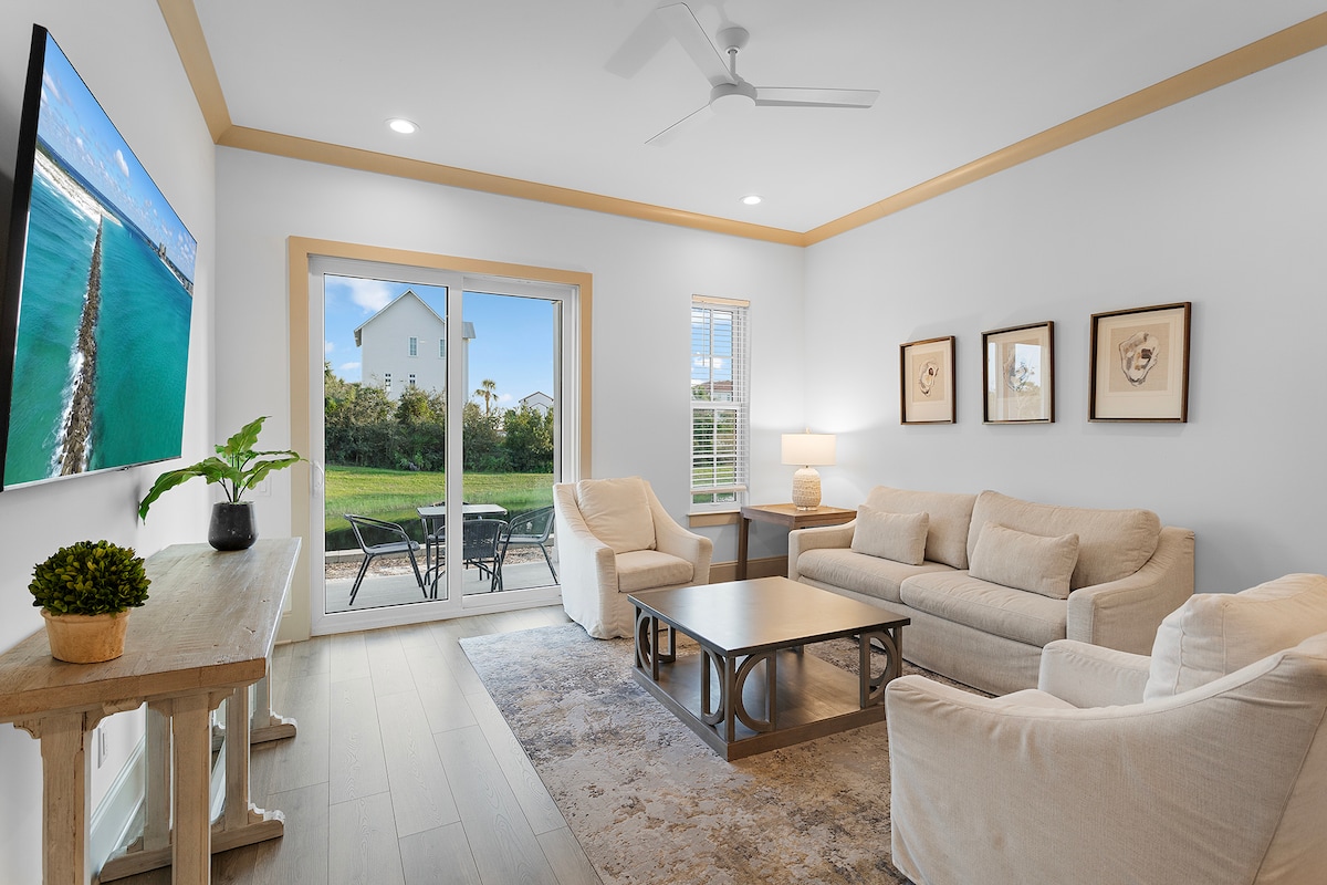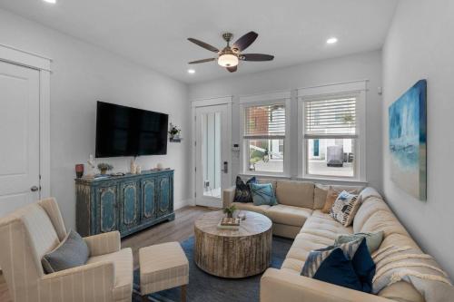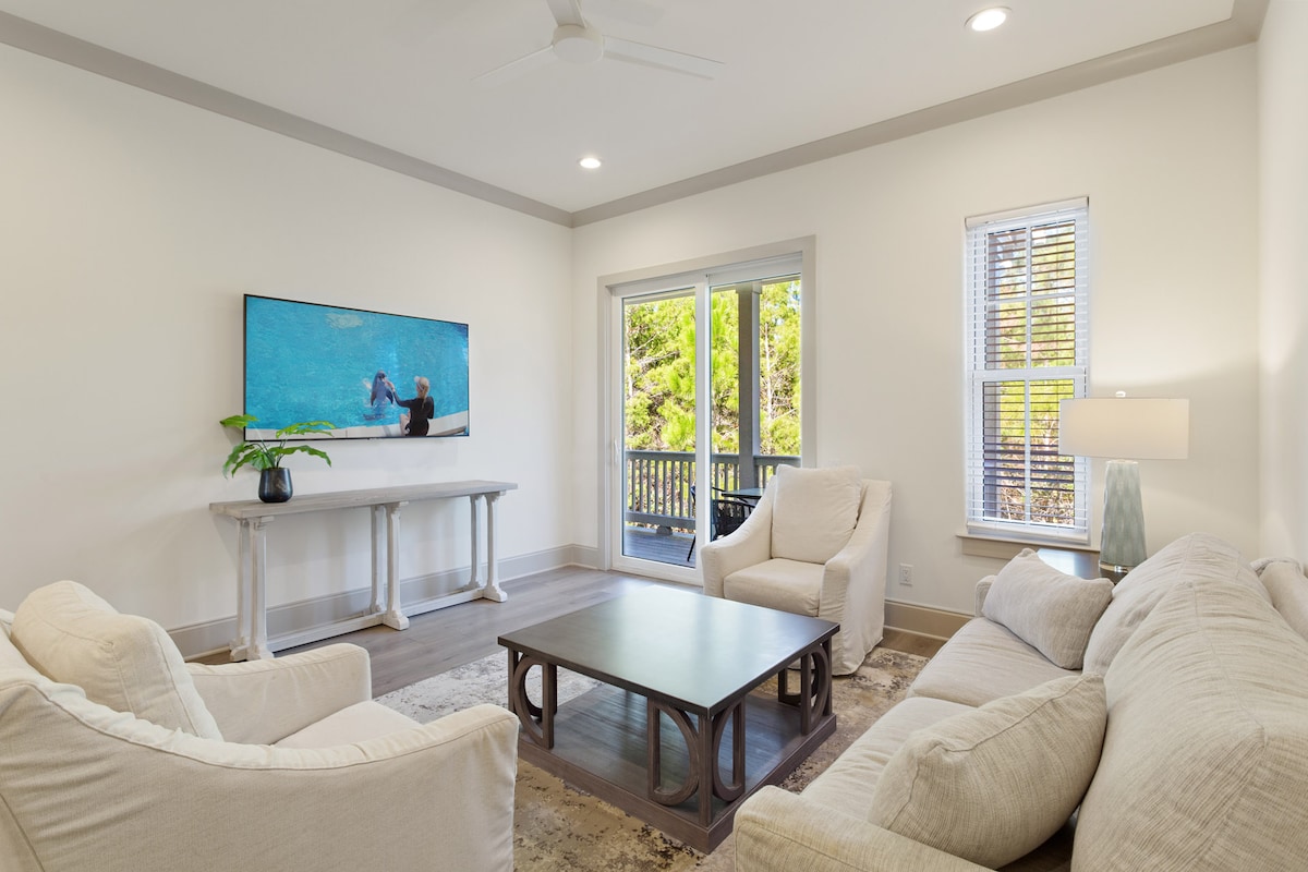 Enter the bright, open living space and bask in the soothing ambiance accentuated by abundant natural light. A comfortable seating area with a large smart TV is perfect for cozy evenings, whether for a movie night or recounting the day's adventures along 30A.