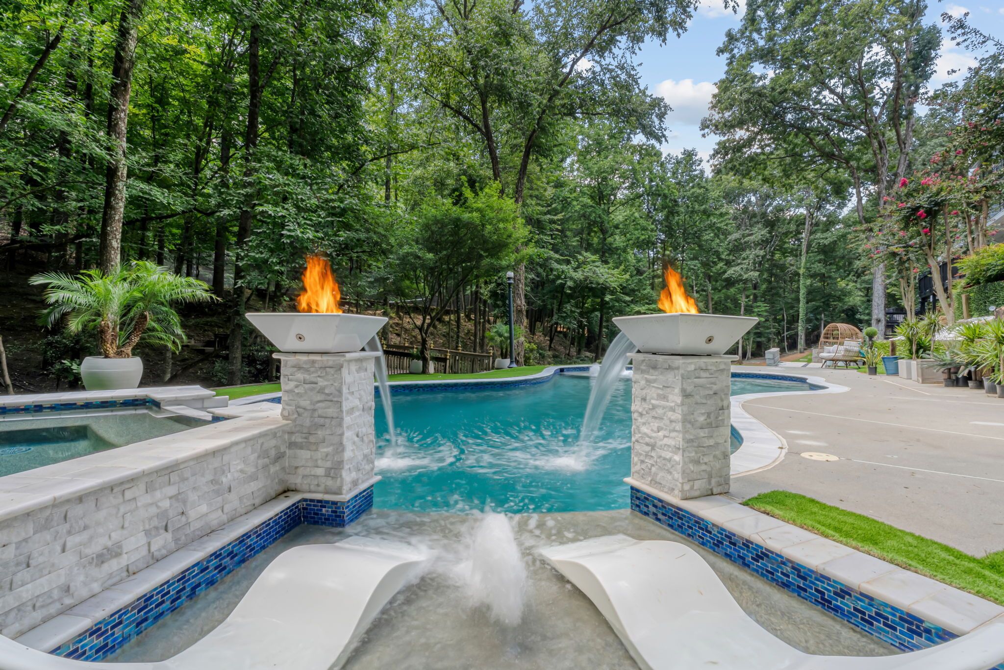 The estate also boasts a full-size, lighted tennis court, ideal for both daytime and evening matches. For those looking to unwind, the property features a beautifully designed swimming pool and whirlpool. The pool area is surrounded by thoughtfully placed fire pits, creating a magical ambiance for evening relaxation and socializing.