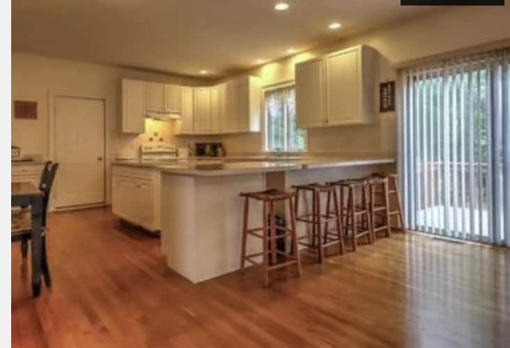 A great room with HDTV, big windows and a door out to the patio. A fully loaded kitchen with dishware, utensils, pots, pans, Cuisinart coffee machine, a Keurig, a pour-over, electric tea kettle, blender, food processor, Nutri Bullet, waffle maker, oils, and spices, coffee and teas. Dine at the kitchen island or at the table in the kitchen nook. 1/2 bath off the kitchen. We also have a 4moms modern highchair.