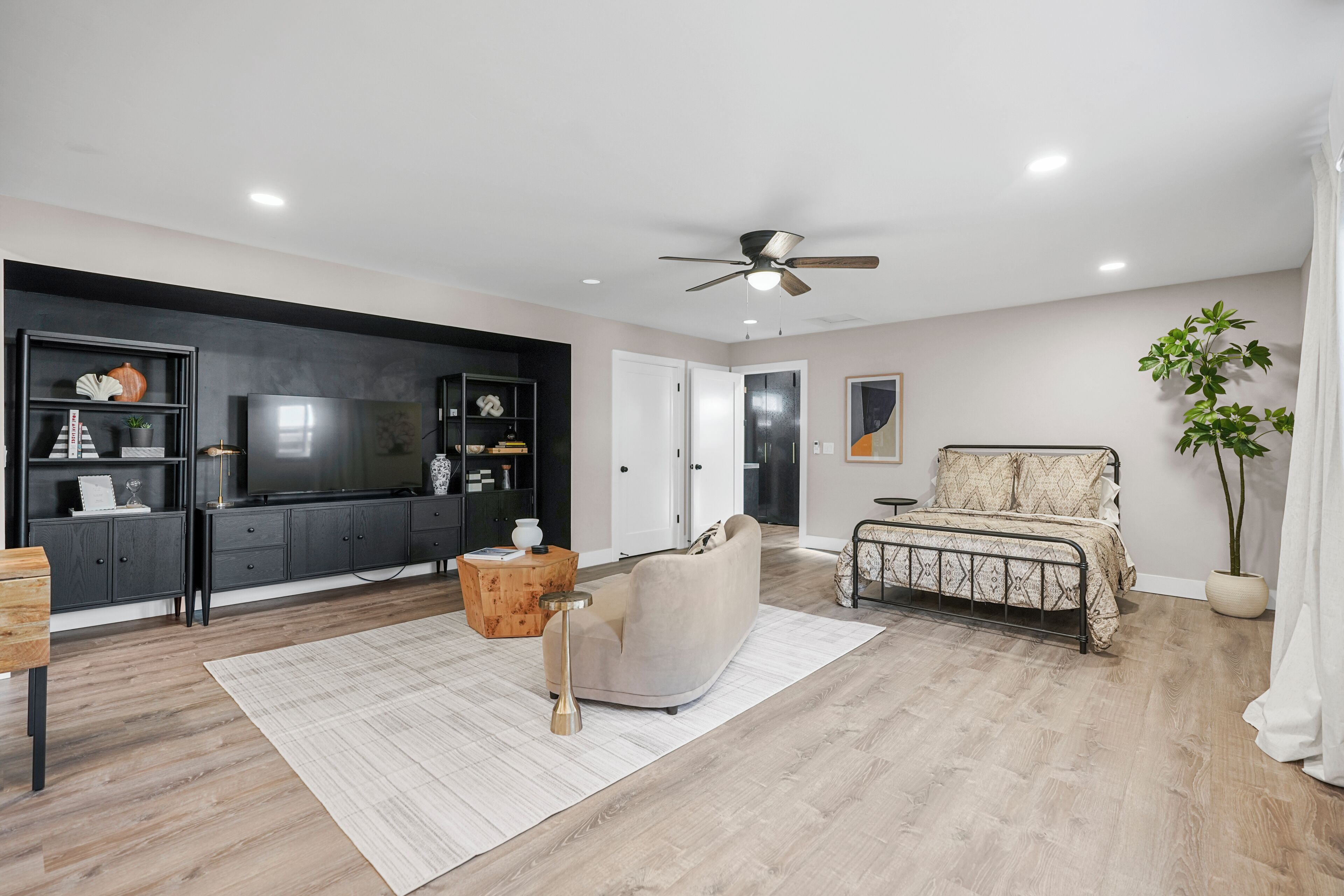 Gather 'round the mesmerizing Media Console Electric Fireplace, and let the soothing ambiance transport you to a state of relaxation. Enjoy your favorite shows and movies on the stunning 58" Samsung Smart TV with Netflix. The 42" Remote Retractable Ceiling Fans with 3 light settings and Bluetooth speakers will make every moment a delight!