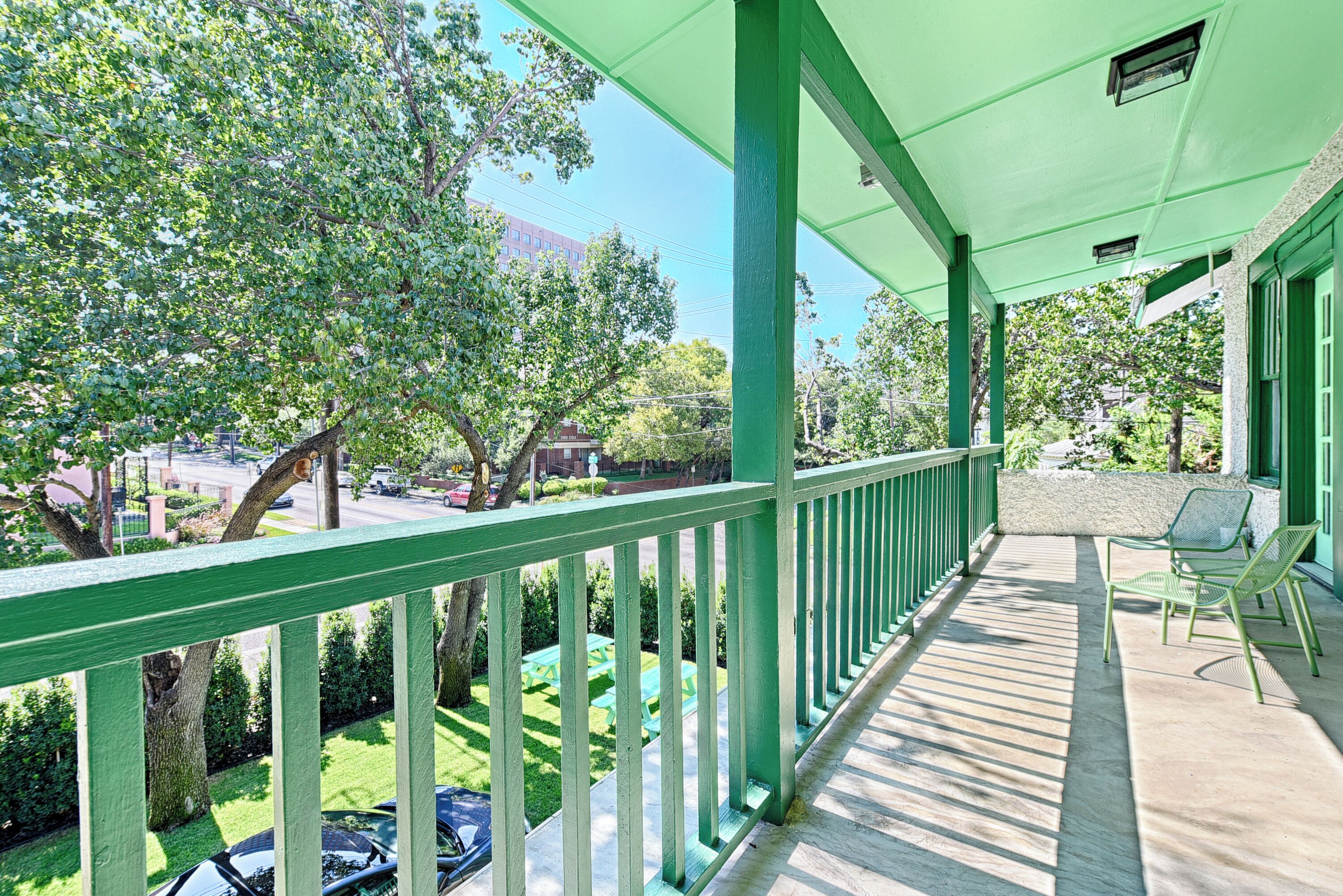 This is the upstairs unit with the deck overlooking Cole Ave. There are 3 private driveway parking spots. Each reservation is limited to 1 parking spot maximum, the driveway spots are first come first serve. There is free street parking, please consult the signage to ensure you are parked in an appropriate area. The street corner can be quite noisy from cars and trucks which is outside our control. The picnic tables and outdoor seating are shared by all the guests on the property and are first come first serve. The Trolley stop is directly on the street corner on the Cole Ave side, look for the Brown M-Line Sign. The Trolley is free and will take you through West Village, McKinney Uptown, Klyde Warren Park, and the Harwood District. There is no pet fee.