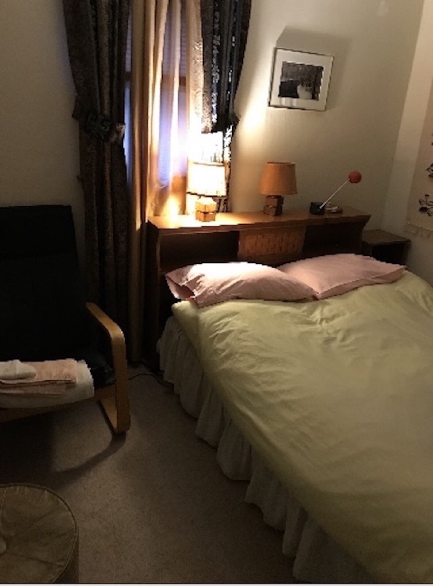 Welcome to One Curious Cottage! This ~120 sq ft room features a full-sized bed. The room comes furnished with a desk and chair, bookshelf, and closet. Bedding (pillows, sheets, duvet and duvet cover) is provided and will be washed between each guest.