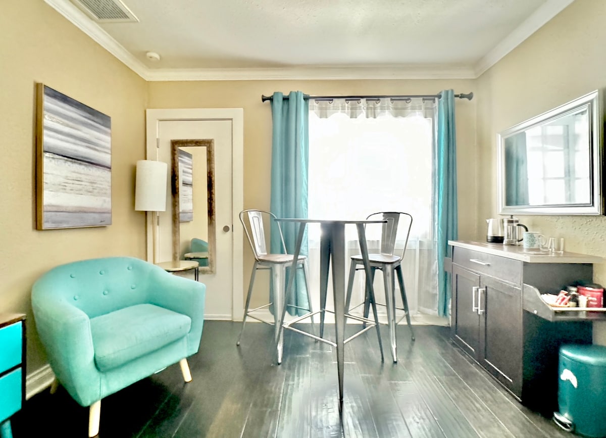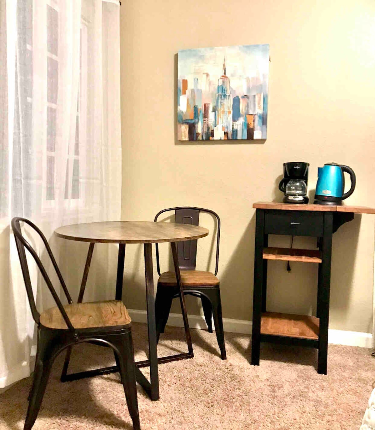 Private Locked Room with private bistro table set and kitchen items, Shared Bathroom, Hallway with shared fridge and microwave, shared patio.