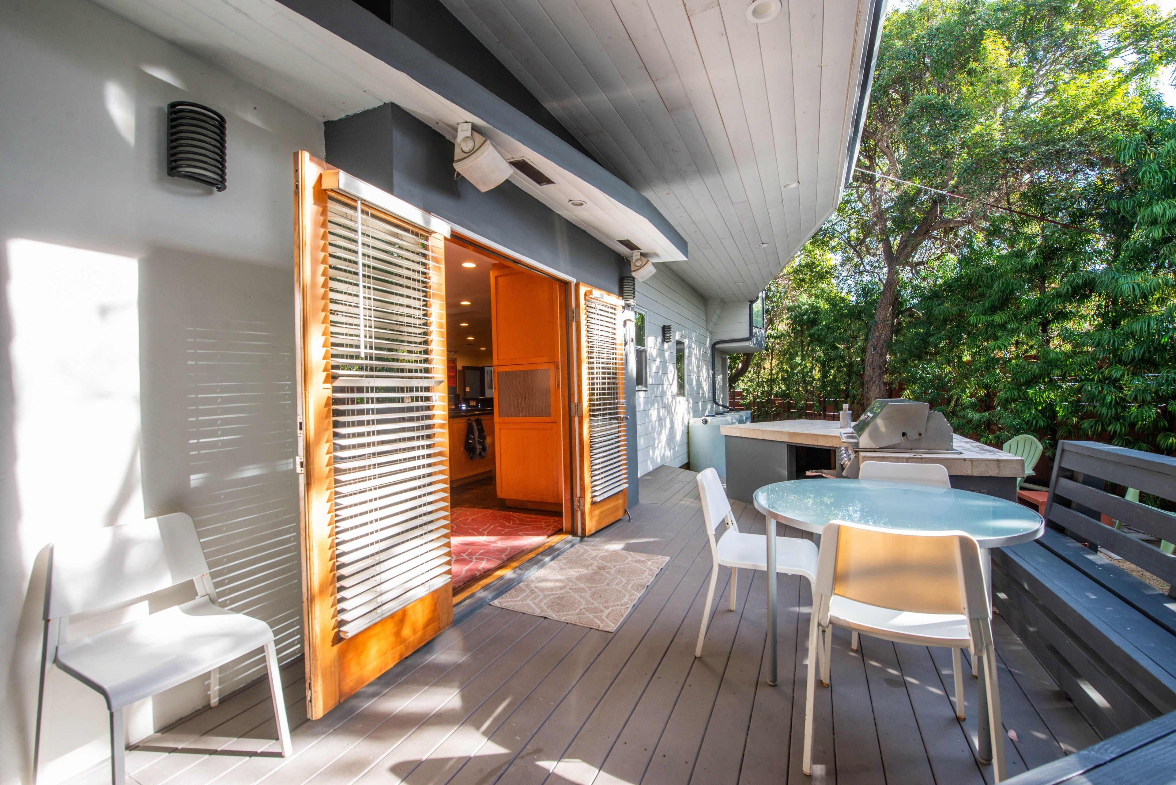 A detached, studio space sits across the back yard, whose occupant shares the backyard and roof deck.