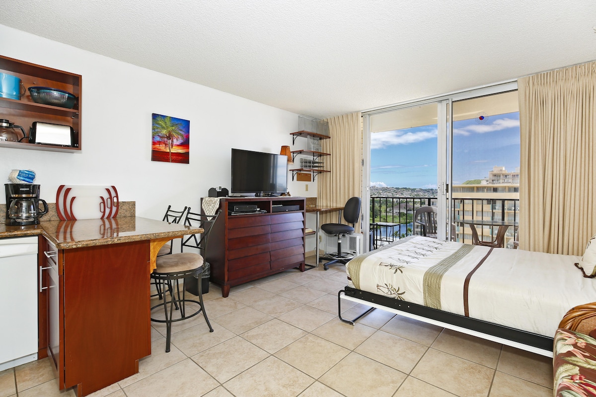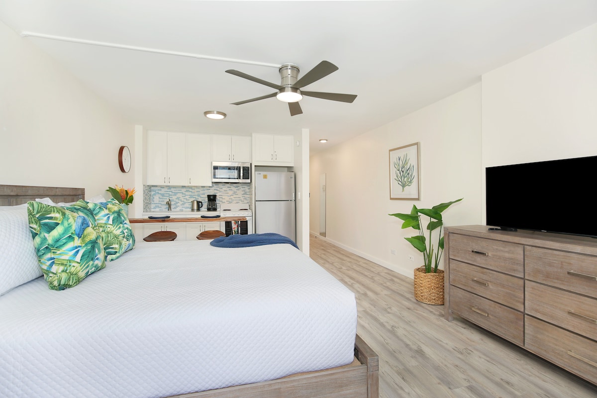 You'll enjoy this newly remodeled (August 2023) 11th-floor studio in the quieter east end of Waikiki. With a full kitchen, free Wi-Fi, and free parking, this cozy unit, with 364 sqft of living space plus a 77-sqft private lanai, is a perfect monthly rental for solo travelers or couples. Sleeps up to 2 Guests with a King bed.