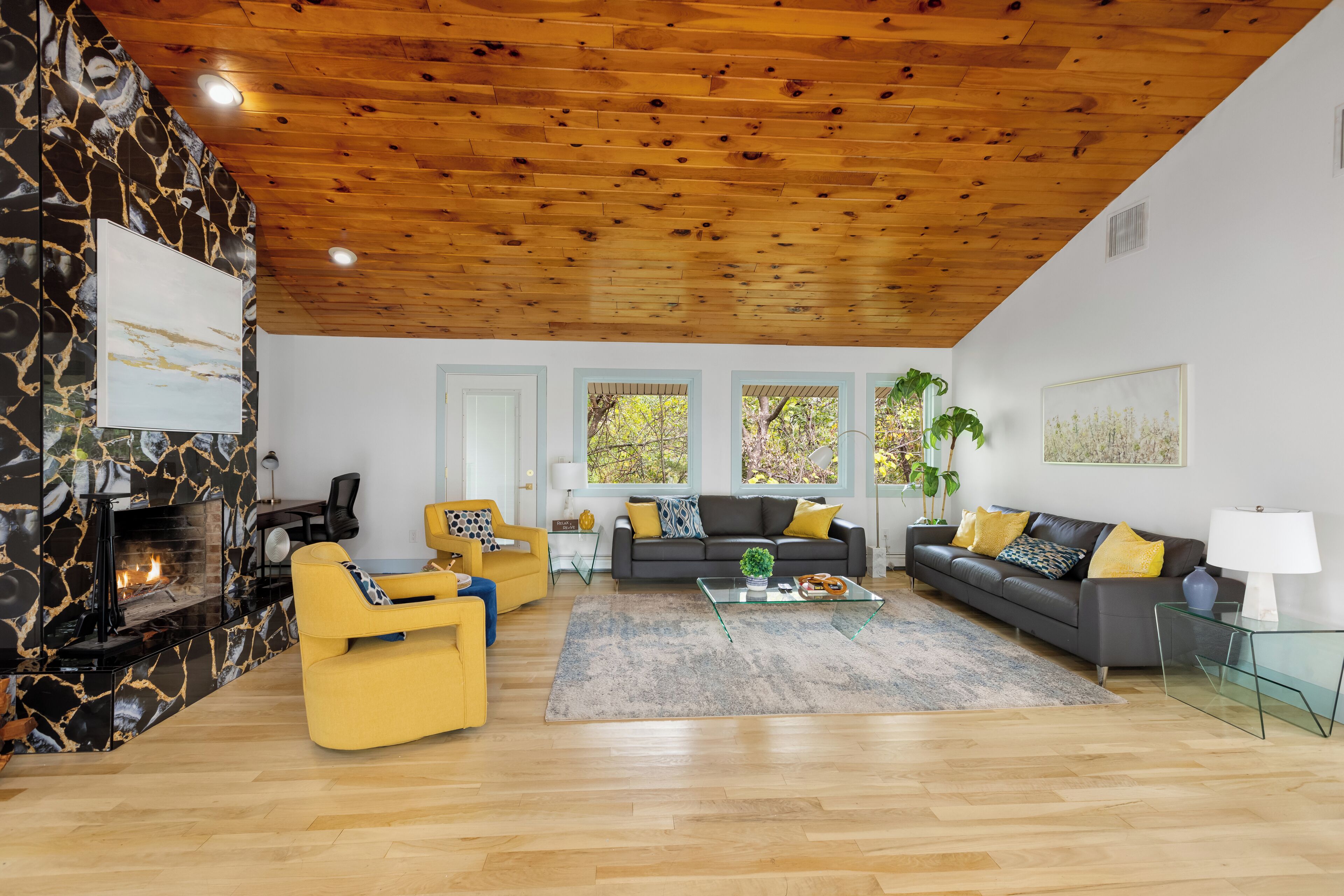 The outdoor spaces are as inviting as the indoors, with a spacious lawn and a large raised deck. Relax in the stylish conversation area or enjoy views of the forest. Downstairs, guests can relax in a shaded seating area or gather around the fire pit for marshmallows and stories. The sprawling lawn offers plenty of space for fun and games.