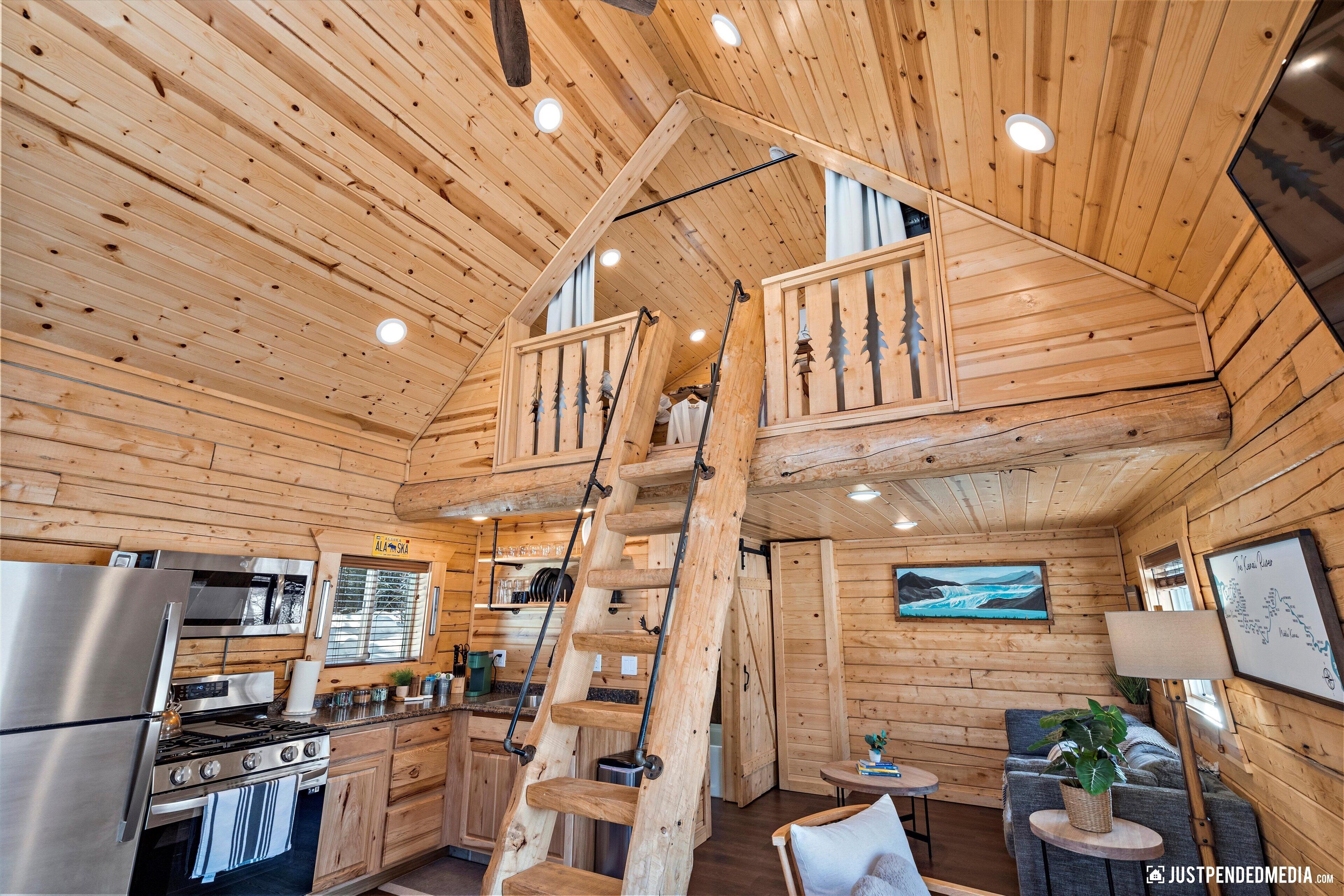 cabin style with 1 bedroom with queen bed, sleeping loft with a queen bed, full kitchen, full bathroom with tile shower/tub, TV with streaming, WiFi.
