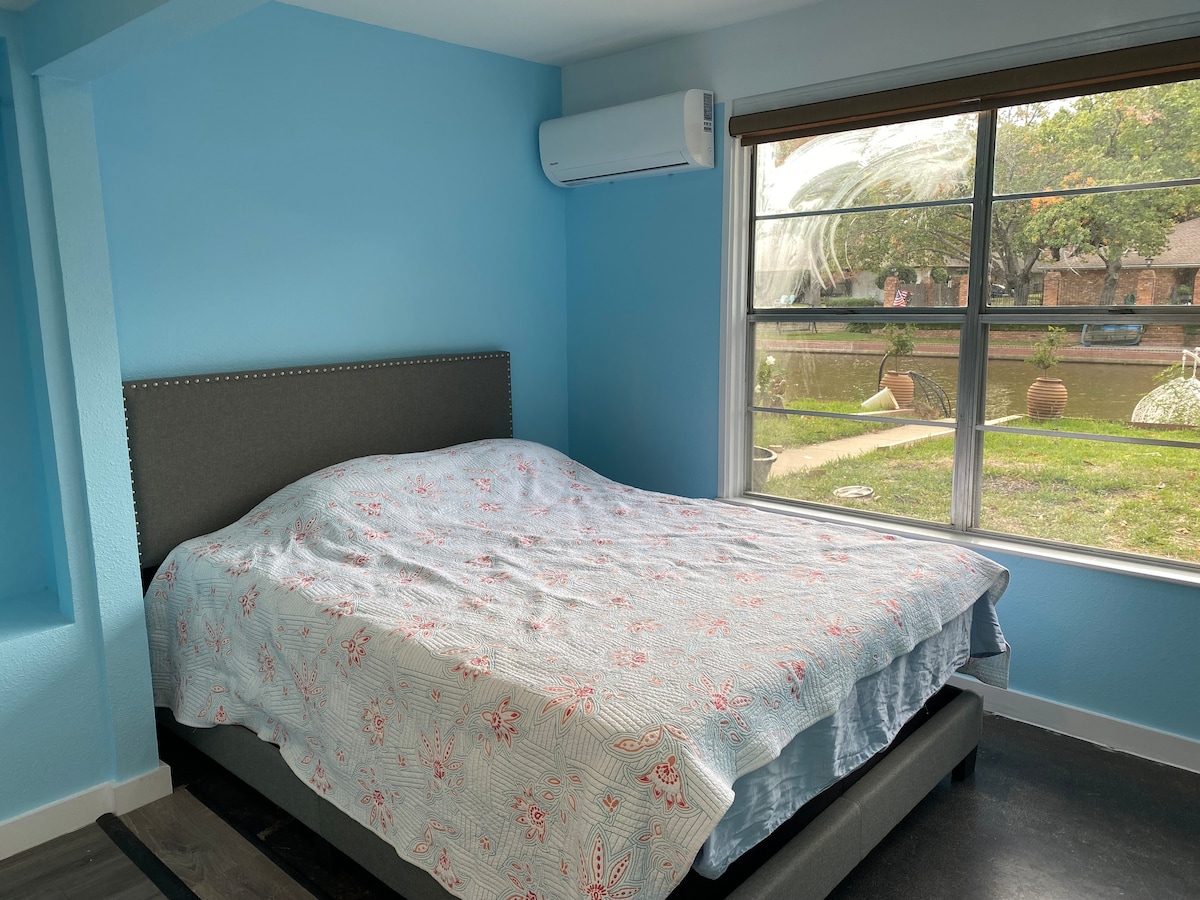 Enter through the garage using a code 🔑. A small hallway leads to your cozy home 🏠 (see photo). This rental space, designed as the primary bedroom. Guests also have access to the shared laundry room 🧺. For maximum comfort in the Texas AC unit is installed ❄️ (during spring, summer & early fall).