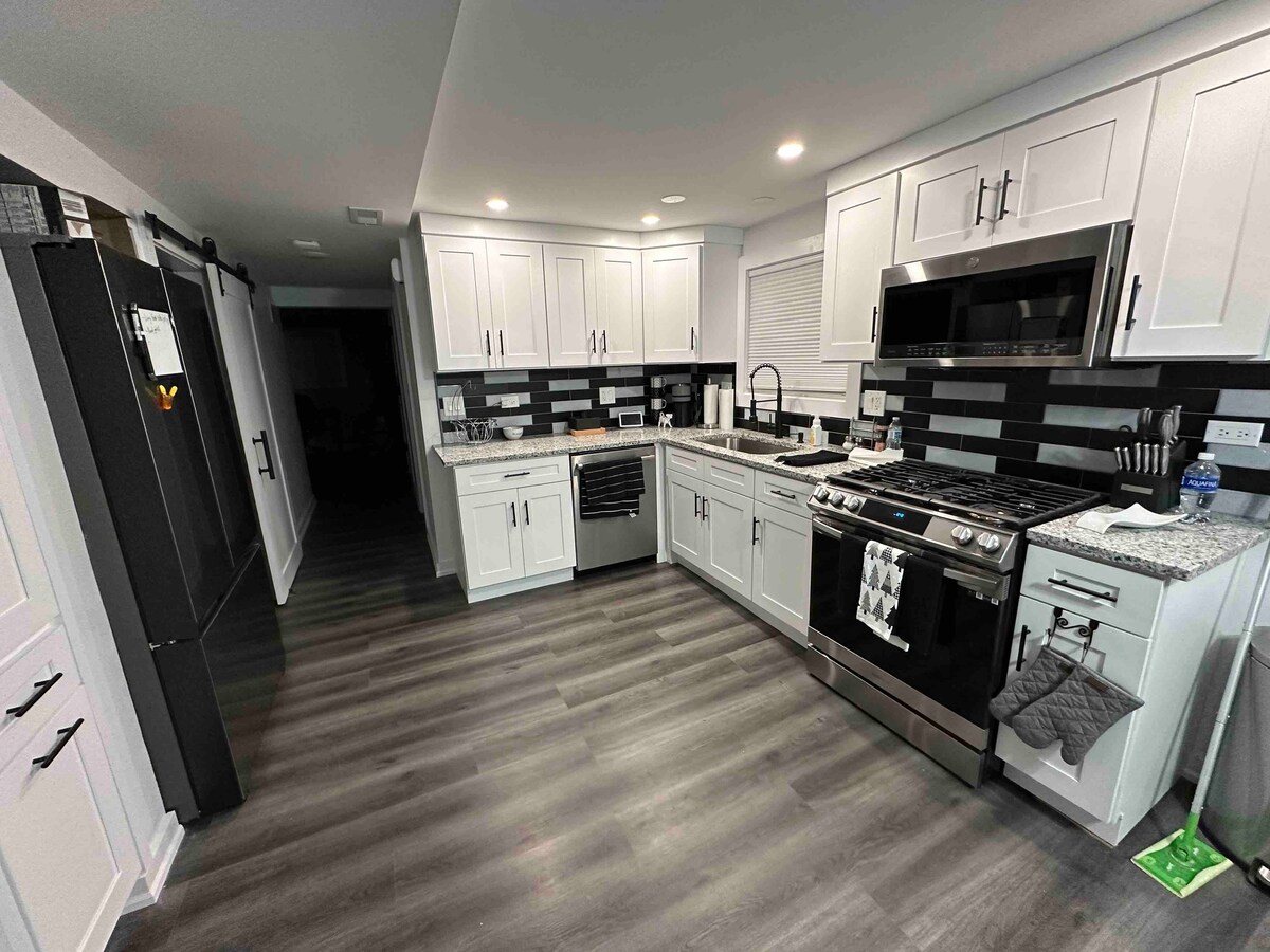 Even do it has a modern feel it also gives you that chicagoan type of feeling which is why this place is also great for a family of 5. Unit includes all utilities with plenty of free street parking and is pet friendly. 2 of the very spacious bedrooms feature queen size beds and plenty of closet space, your third bedroom is slightly smaller but still has a full size bed. Living room with a large 70" TV, kitchen includes stainless steel appliances and all essentials including toaster, coffee maker, microwave, blender to name a few, Eat in kitchen area that seat 4 people at the time and 2 other chairs in the unit that can be added. Laundry room has a modern stacked washer and dryer with space to fold clothes and a full ironing board.