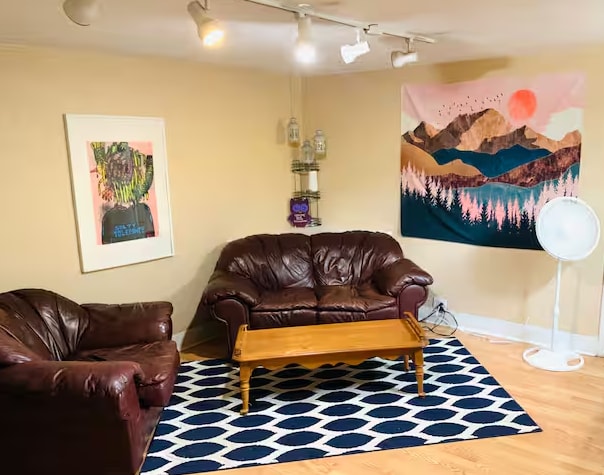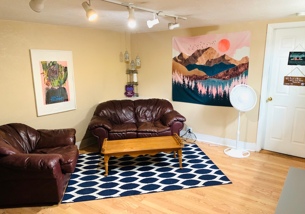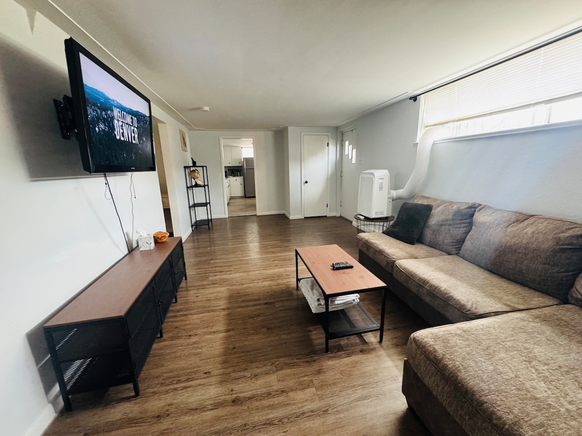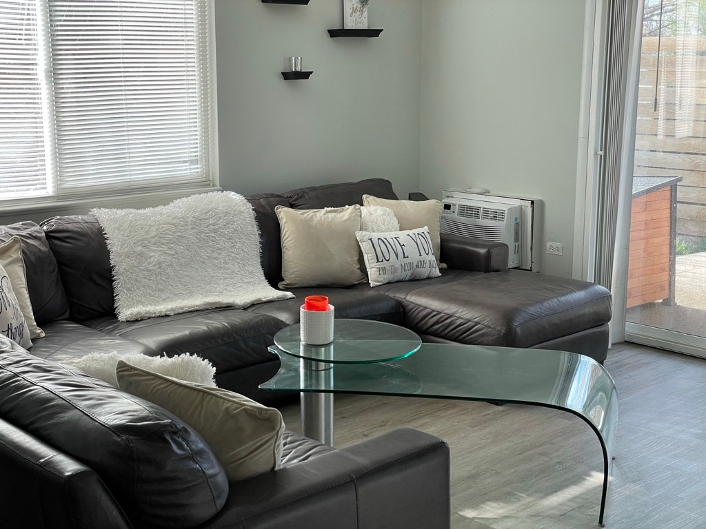 A bright living area perfect for 1 or two to unwind as well as focus on work. Space is comes with ergonomic work area, fully equipped kitchen, personal workout equipment (Peloton / weights), outdoor smoker grill, & in-unit washer dryer. Temperature is controlled by Nest central heating & cooling. In addition, 2nd window AC unit in bedroom for Summer comfort.