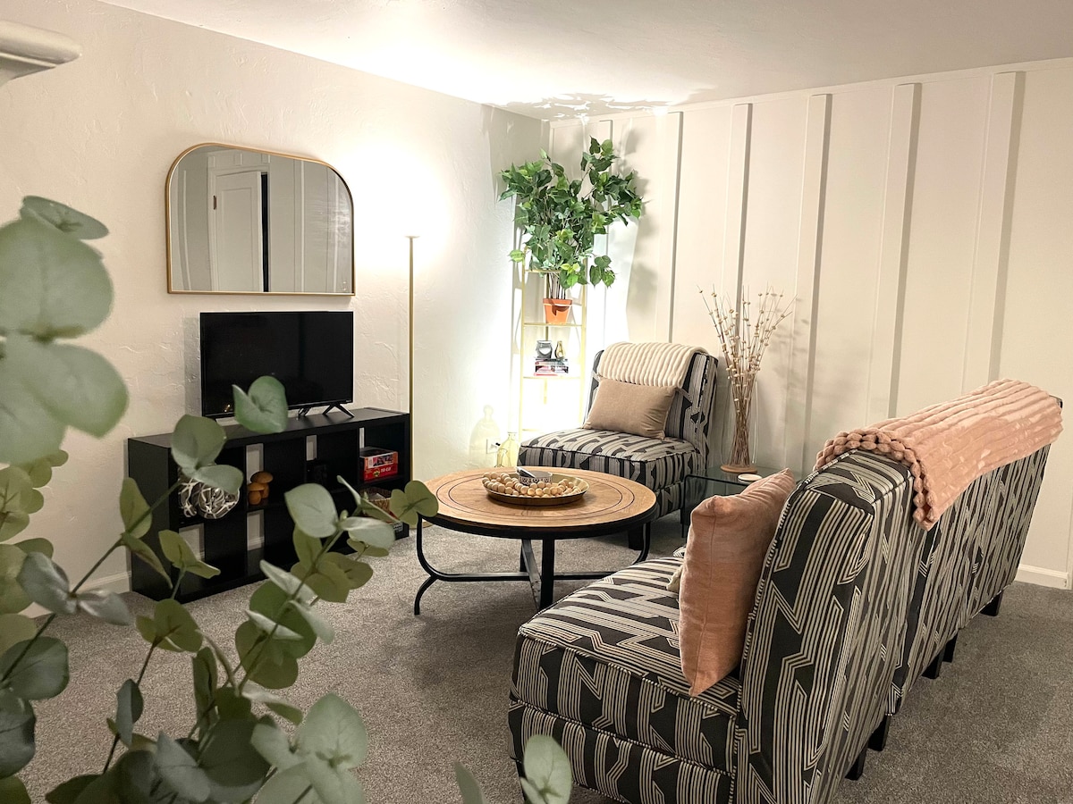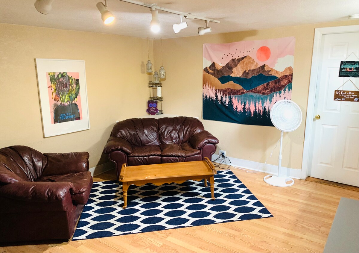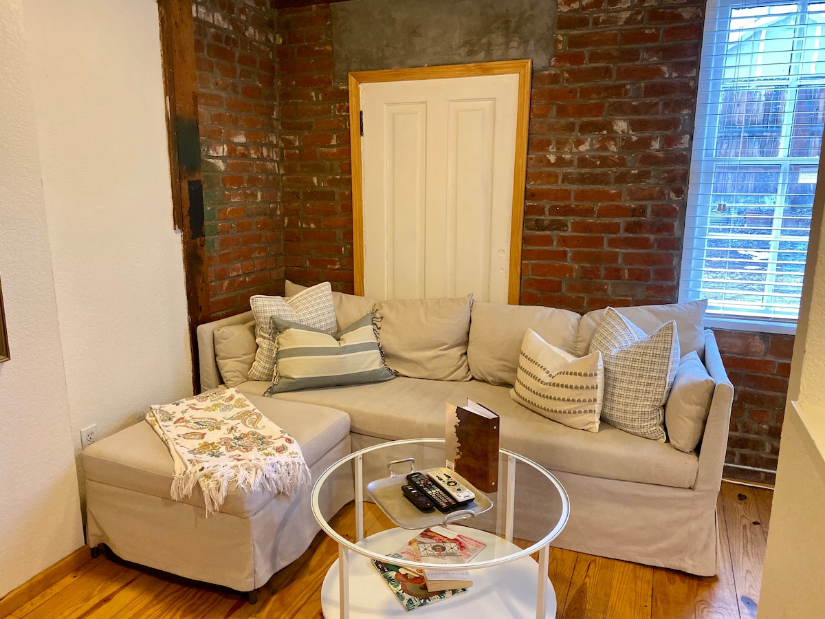 A bright living area perfect for 1 or two to unwind as well as focus on work. Space is comes with ergonomic work area, fully equipped kitchen, personal workout equipment (Peloton / weights), outdoor smoker grill, & in-unit washer dryer. Temperature is controlled by Nest central heating & cooling. In addition, 2nd window AC unit in bedroom for Summer comfort.