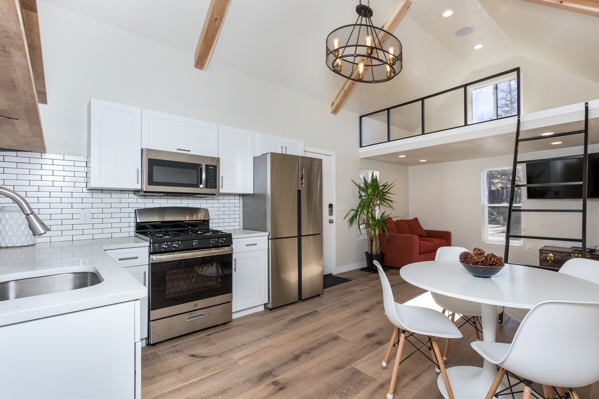 This lofty space is outfitted to be a cozy home-base with a two-sided gas fireplace, skylights above the bed with automated shades, washer / dryer and a fully stocked kitchen waiting for you to cook your favorite meal.