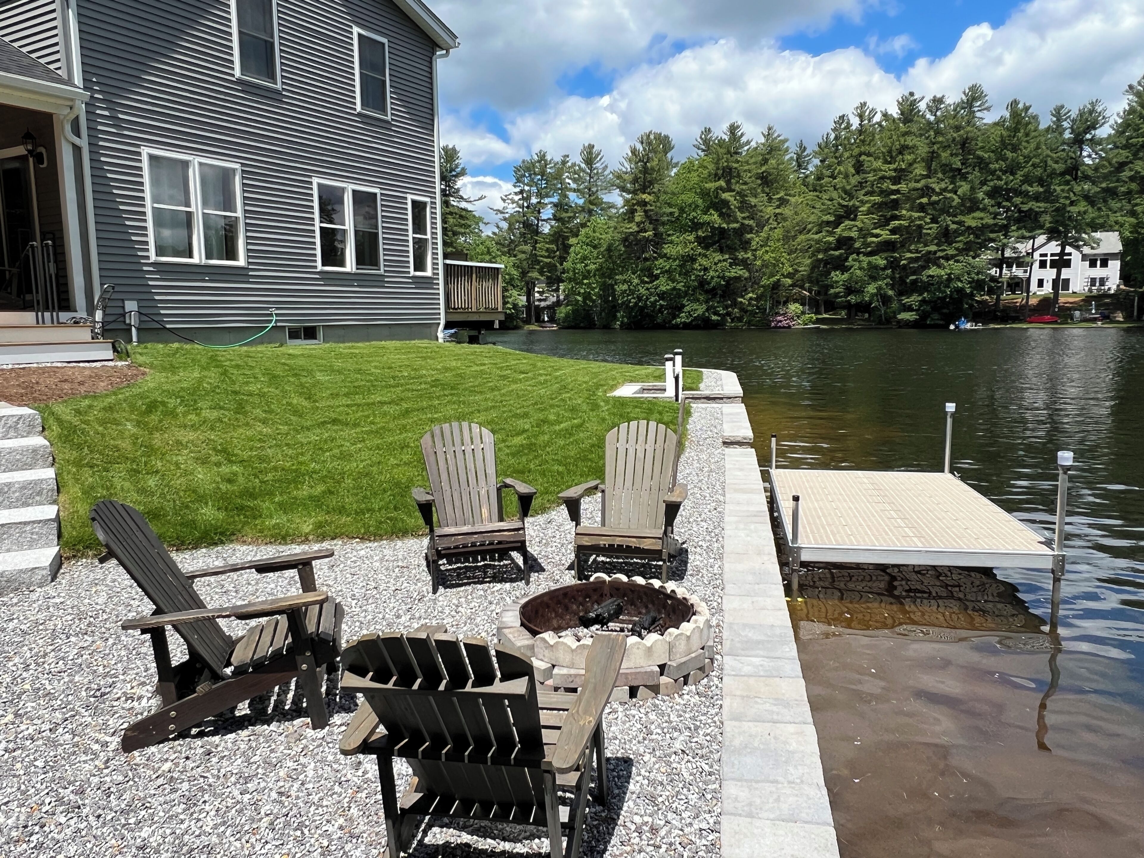 The fire pit and its 4 Adirondack chairs are set at the lake wall.