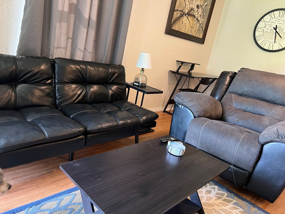 Living room -two couches and two recliners, fireplace, DirecTV.