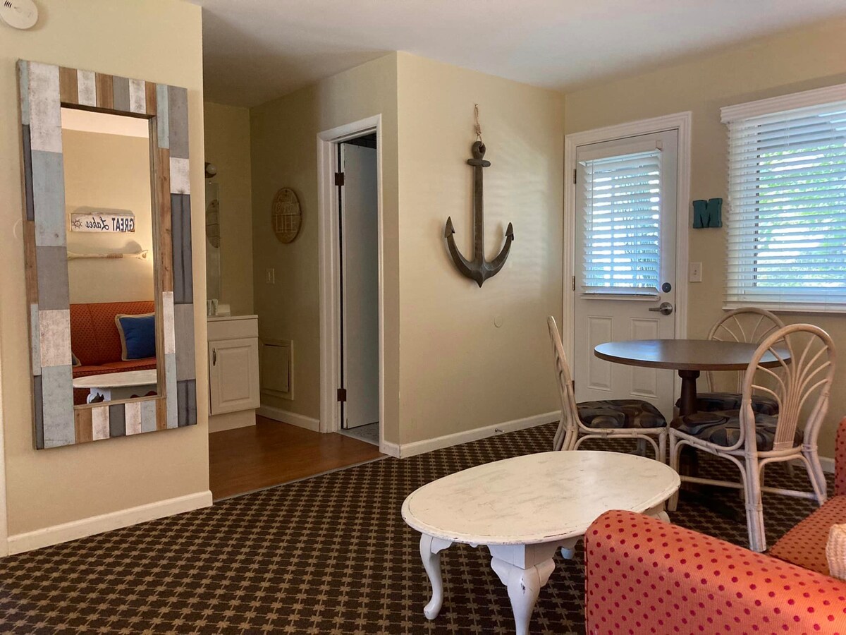 On a sandy bluff overlooking the vast inland sea they call LAKE MICHIGAN, sits a special place, tucked in amid the pine and maple: 4951 … the perfect one-bedroom getaway for couples who don’t mind feeling just a little cut off from civilization, who won’t miss leaving behind the sounds of cars, lawnmowers, and leaf blowers … who won’t mind being lulled to sleep by the sound of waves lapping the sand, or breeze stirring the trees: water and wind.