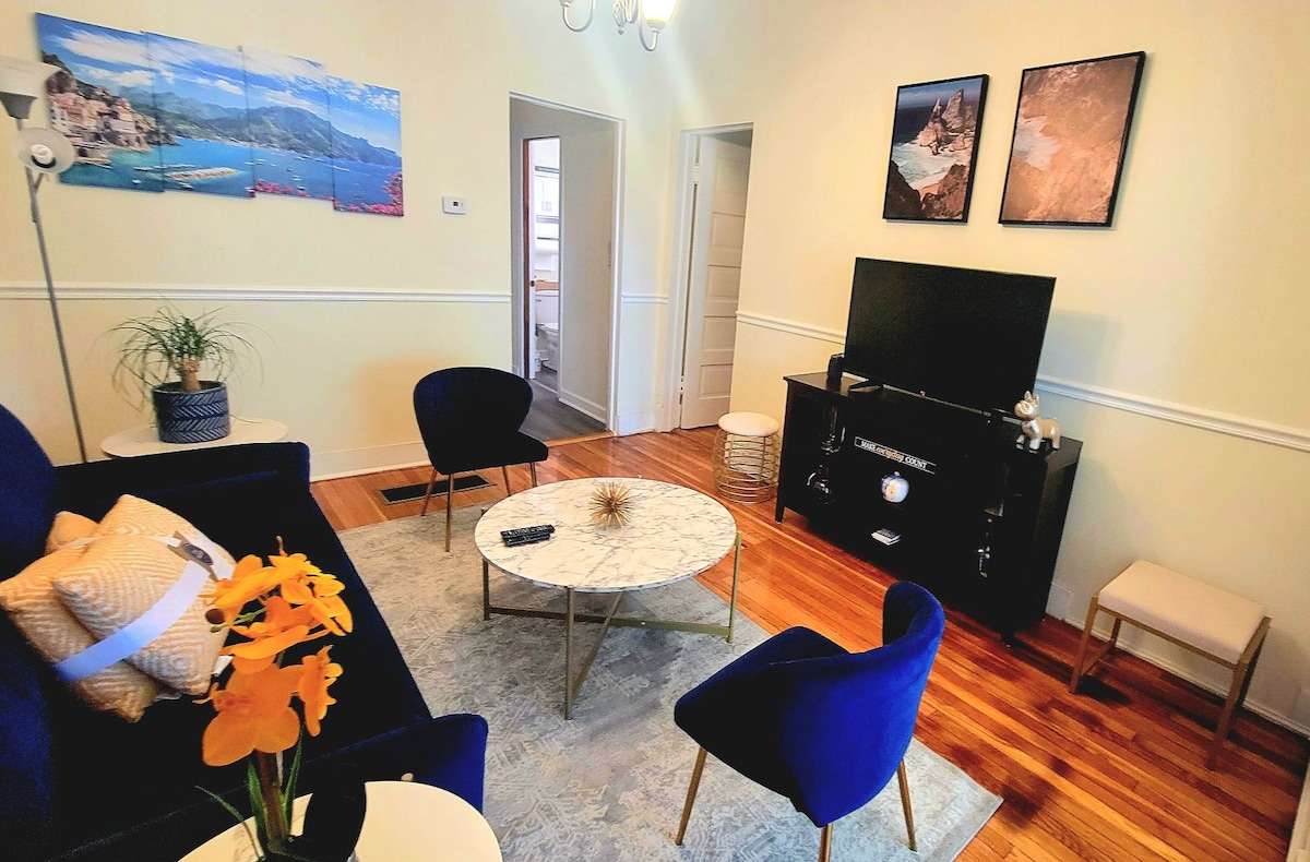 The Great Migration Guest House features suites for different preferences ~ Pleasure in Everything is our most spacious room, with queen bed; Daytripper is cozy and lush, with double bed and vanity; and Wisdom, is ideal for visiting academics, with a foldout sofa bed, desk, and plush reading chair with ottoman. The living room features an additional sleeper couch. The suite hosts a fully equipped cook’s kitchen with stainless steel appliances including microwave and dishwasher, full cutlery service, dining room area for six (6), in-unit laundry, smart tv’s with free Netflix service in the living room and in each bedroom; and all utilities plus wifi are included. Flowerful garden deck in the rear, with backyard featuring vegetable garden, grilling area, and free off-street gated parking. Luxury appointments throughout, including all linens, housewares, and cleaning supplies for an exquisite short or long-term stay.