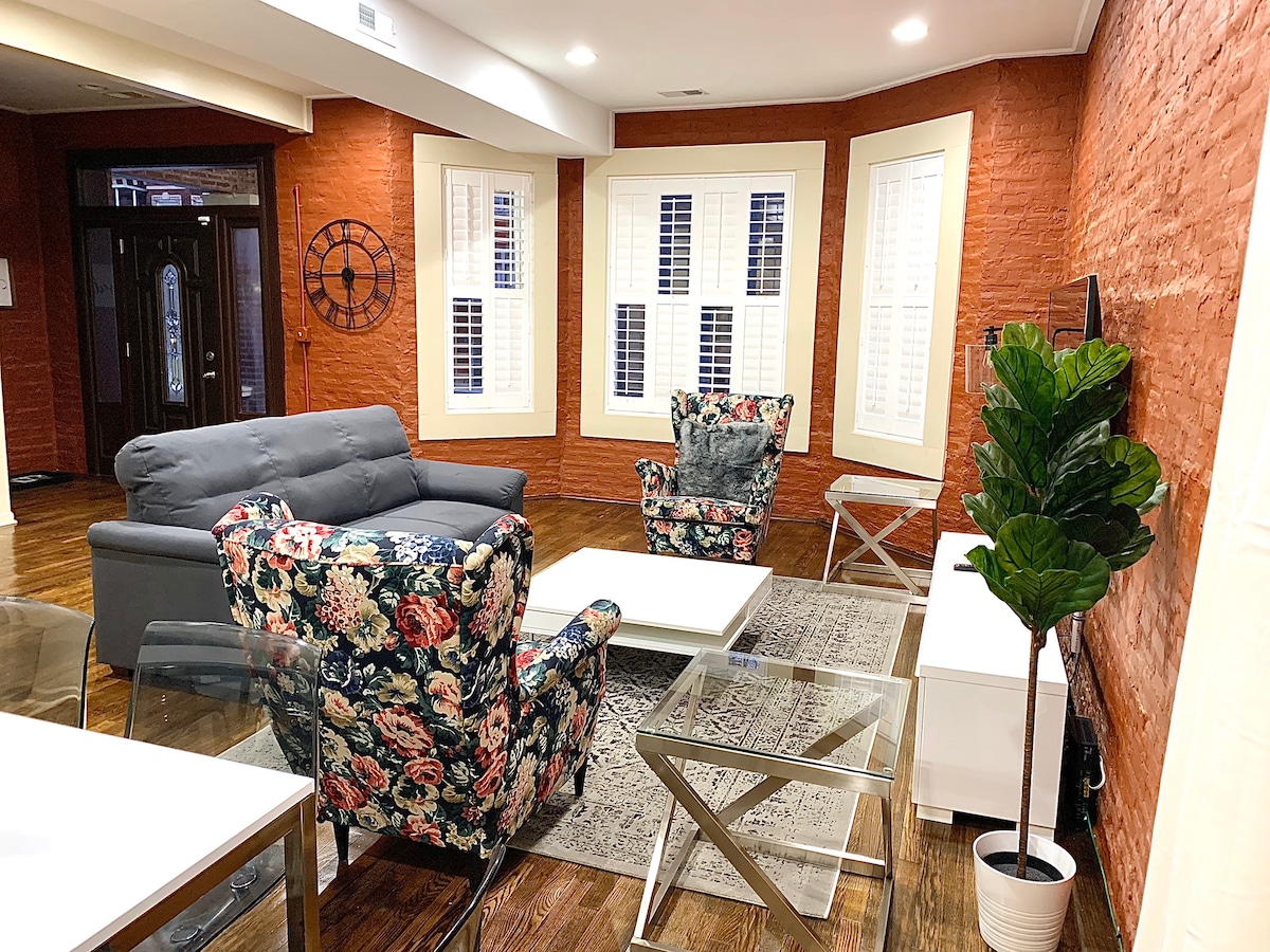 Come experience our black and white themed non-smoking building just 6 minutes from the University of Chicago. Guests enjoy laundry service ($40 max), 24 hour concierge and weekly cleaning at our unique property. This 1895 vintage co-living space has been lovingly decorated with custom furniture and art throughout its three levels. Stay with us from 1-12 months in the heart of our vibrant city on a quiet, residential block. Room 8 is a primary suite with a private bathroom.