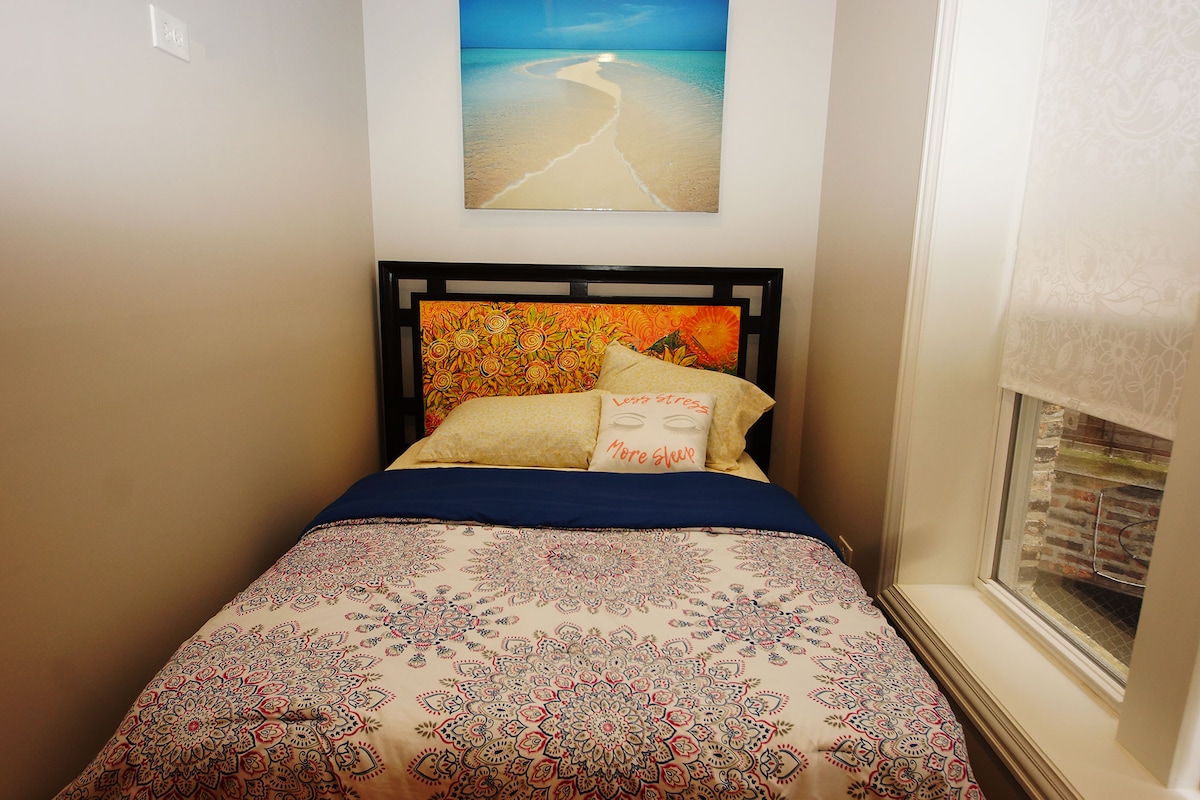 A cute, private bedroom with one full-sized bed in this contemporary and comfortable 3 bedroom, 1 bath apartment in Chicago's Historic Woodlawn community. The colors and scenic decor match natural earth and sky tones to give visitors a feeling of being on a peaceful hillside vacation. Guests will share common areas such as living room, dining room, bathroom, kitchen, office and patio. All of our guests are adults and respect the private and common spaces.