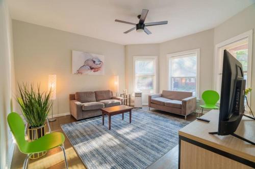 Chateau de Woodlawn - Peaceful 3 bedroom apartment. Offers accommodations in Chicago, 7.4 miles from Field Museum of Natural History and 7.7 miles from Adler Planetarium & Astronomy Museum. 3 miles from Museum of Science and Industry - Chicago and 5.3 miles from Guaranteed Rate Field, the property features a garden and a terrace. The apartment also offers free Wifi, free private parking, and facilities for disabled guests. The air-conditioned apartment consists of 3 bedrooms, a living room, a fully equipped kitchen with an oven and a coffee machine, and 1 bathroom with a bath and slippers. Towels and bed linen are featured in the apartment. The accommodation is non-smoking. Buckingham Memorial Fountain is 8.4 miles from the apartment, while DePaul University is 8.5 miles away. Midway International Airport is 7.5 miles from the property.