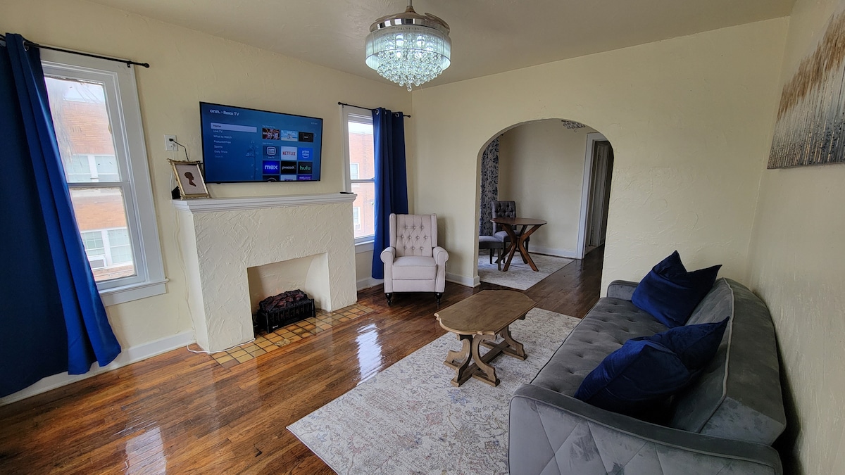 Relax and unwind in the inviting living area, complete with comfortable seating, a 50" tv, and a cozy atmosphere perfect for lounging after a day of exploring the city.
