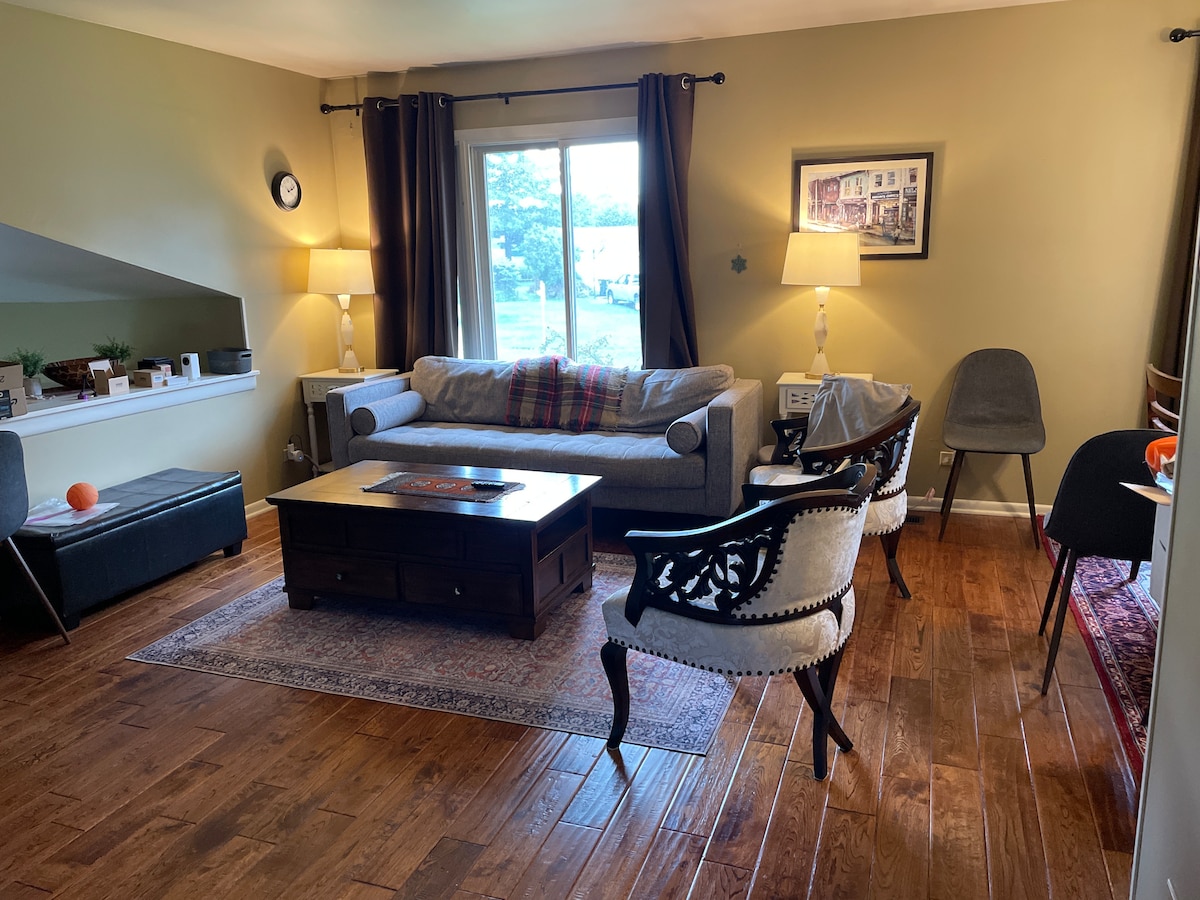 Welcome to the lower level of our private home, Enjoy the comforts and conveniences of the homes excellent location. The private space includes a nice and very comfortable bedroom, private bath, living room, and kitchenette. During warmer months, guests are invited to use the deck and shared 3 seasons porch. All guests are free to stroll around the acre yard and enjoy the beautiful pond and many gardens.