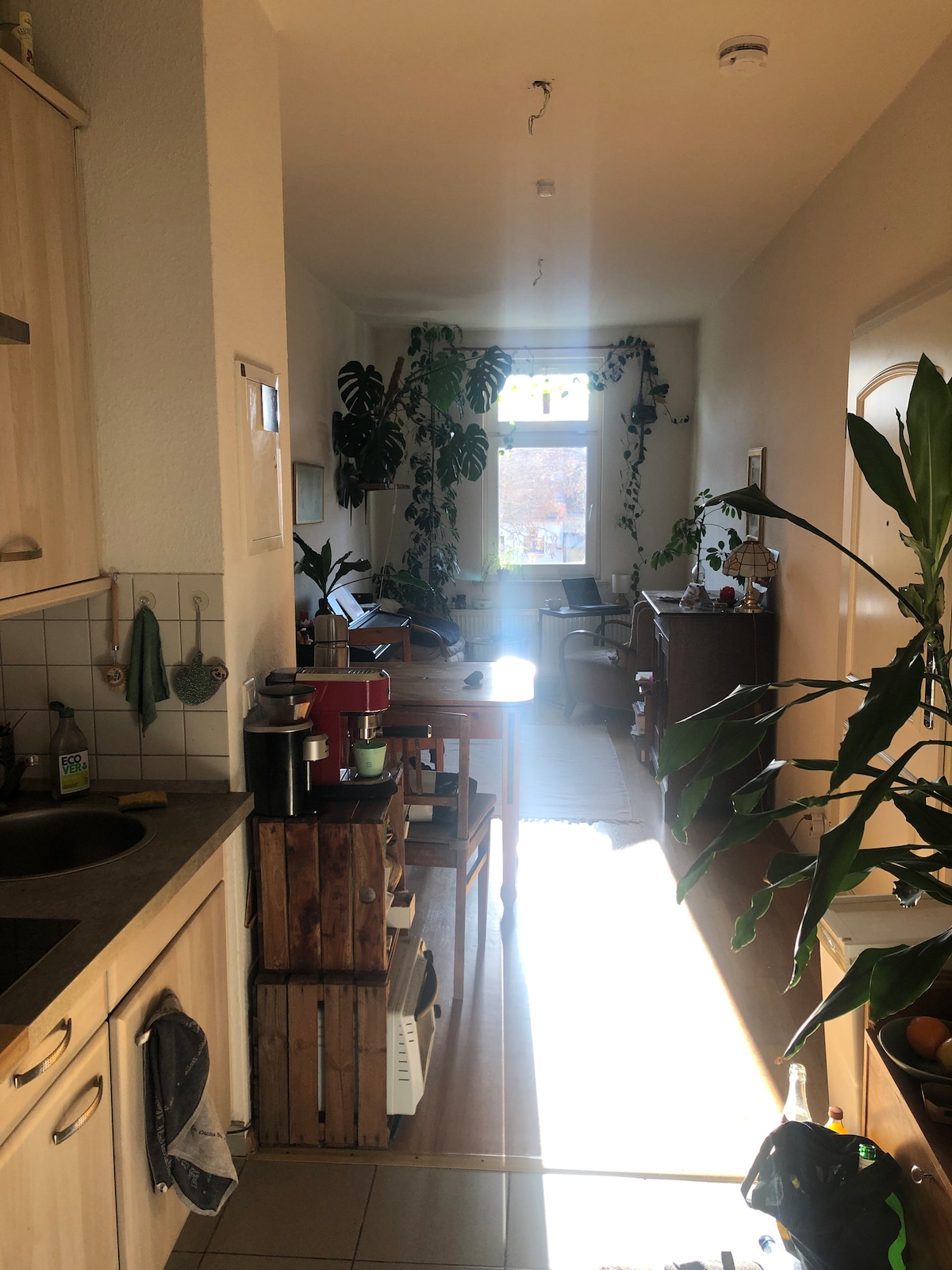 The kitchen is fully equipped. It is perfect for planning the day in Leipzig at the large dining table with a fresh coffee or tea.