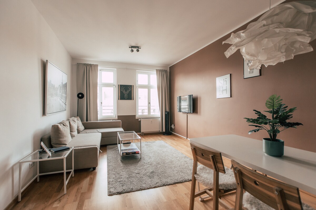 3 large and light-flooded rooms, stylishly furnished on spacious 73 sqm, 8 min walk to the train station and 12 min to the city center.