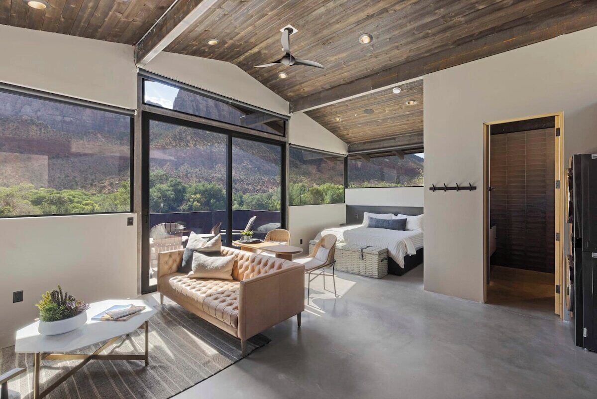 We aim to complement the experience of visiting Zion by bringing the feeling of the outdoors inside: natural light, airy ceilings, and canyon colors. A glass door and tall windows make the private courtyard feel like part of the interior.