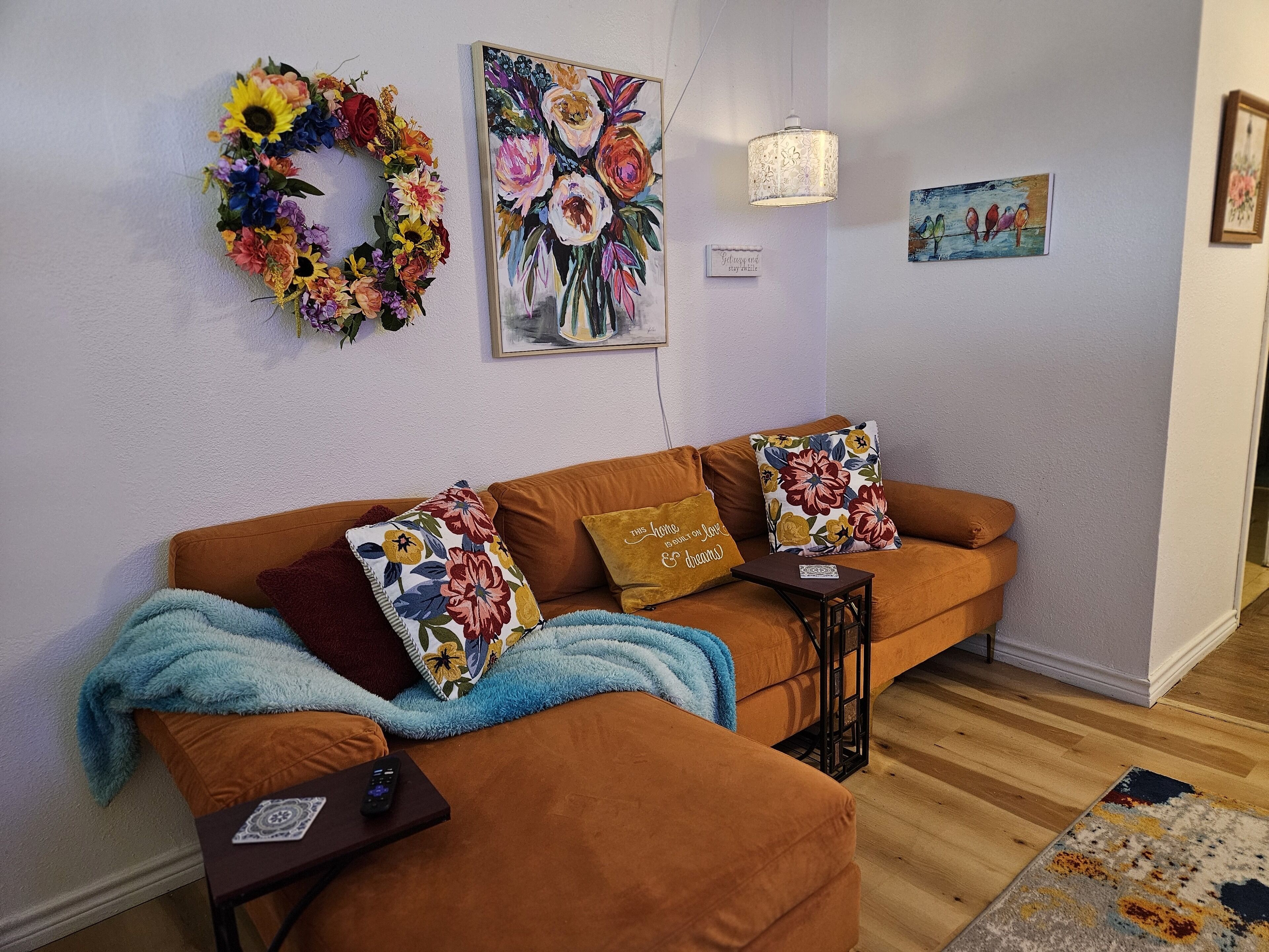 This sophisticated retreat, laced with western tones, sits less than a 1/4 mile from Hardin-Simmons University & Hendrick Medical Center; 2 miles from Downtown Abilene dining, shopping, & entertainment. The ground floor features a snug living space, full-sized appliances in a stocked kitchen, and the sleek sky-lit bathroom. Upstairs, you’ll find a lovely navy bedroom designed for a soothing sleep. We hope you’ll find this apartment to be a luxurious oasis coming off the dusty trail!