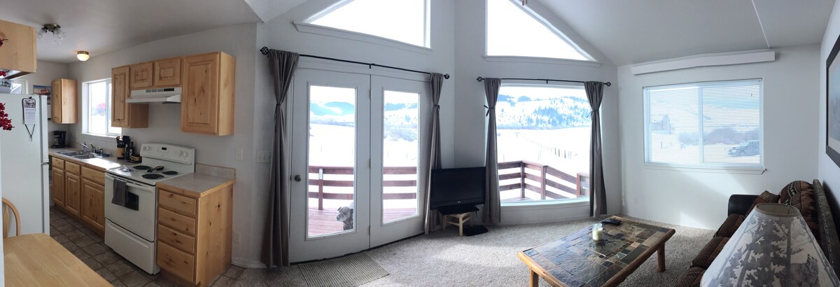 Our 1 Bedroom Loft Condo offers a king or queen bed in the downstairs bedroom as well as two queen size beds in the upstairs "loft", and a queen sofa sleeper in the living area. Custom designed, our 1 Bedroom Loft Condos can sleep up to 6 people, and come complete with a full kitchen w/ granite counter tops. What a great way to wind down after a horseback riding, snowmobiling, or a nice game of golf on the Johnny Miller Golf Course, which happens to be right off the rear porch!
