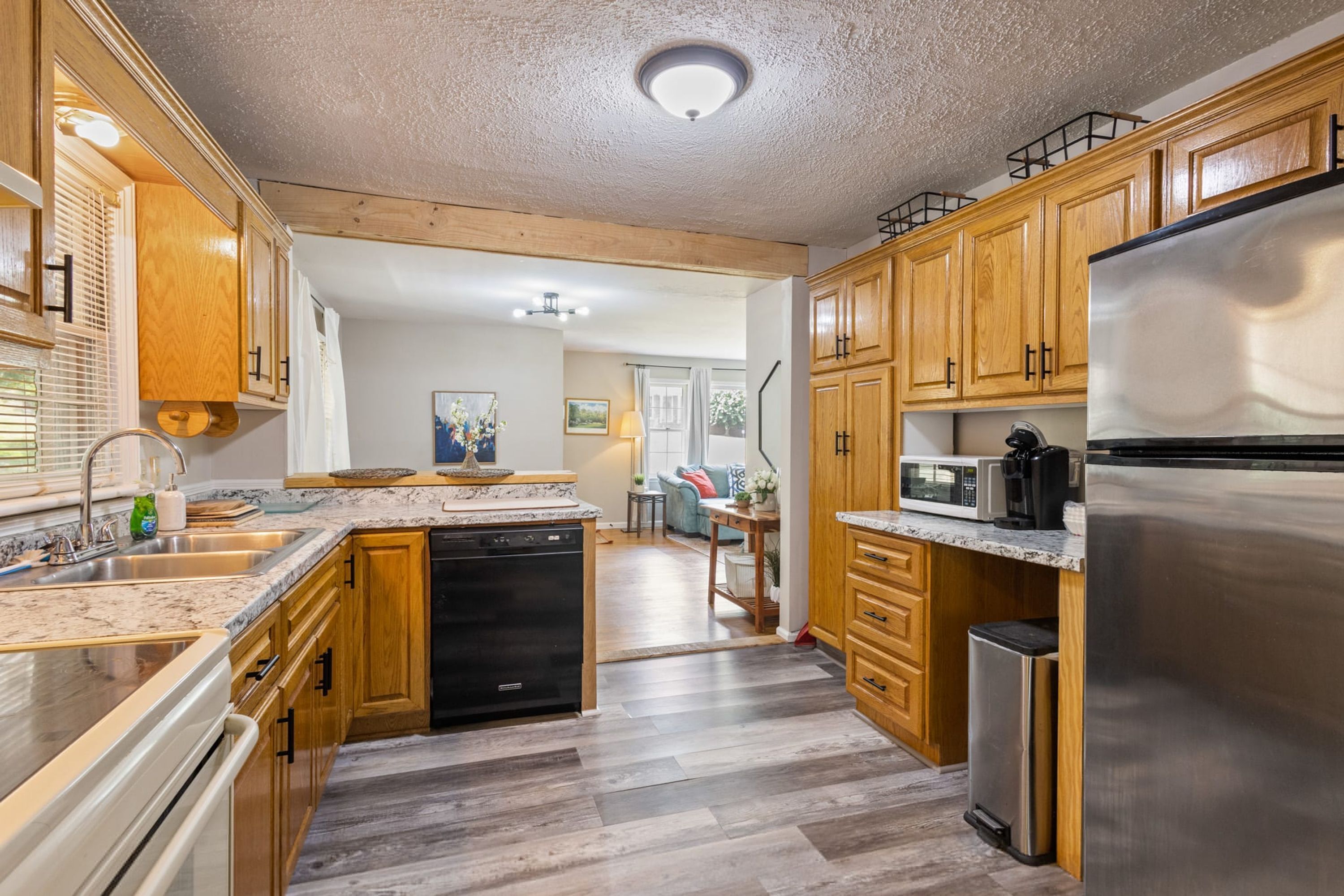 Fully stocked kitchen with pots and pans, blender, toaster, Cuisinart auto grind coffee maker, air popcorn popper and plastic cocktail glasses etc. Stone counters! Marble top bay window overlooking beautiful pastures of horses. Stone counter top eating area with two counter stools.