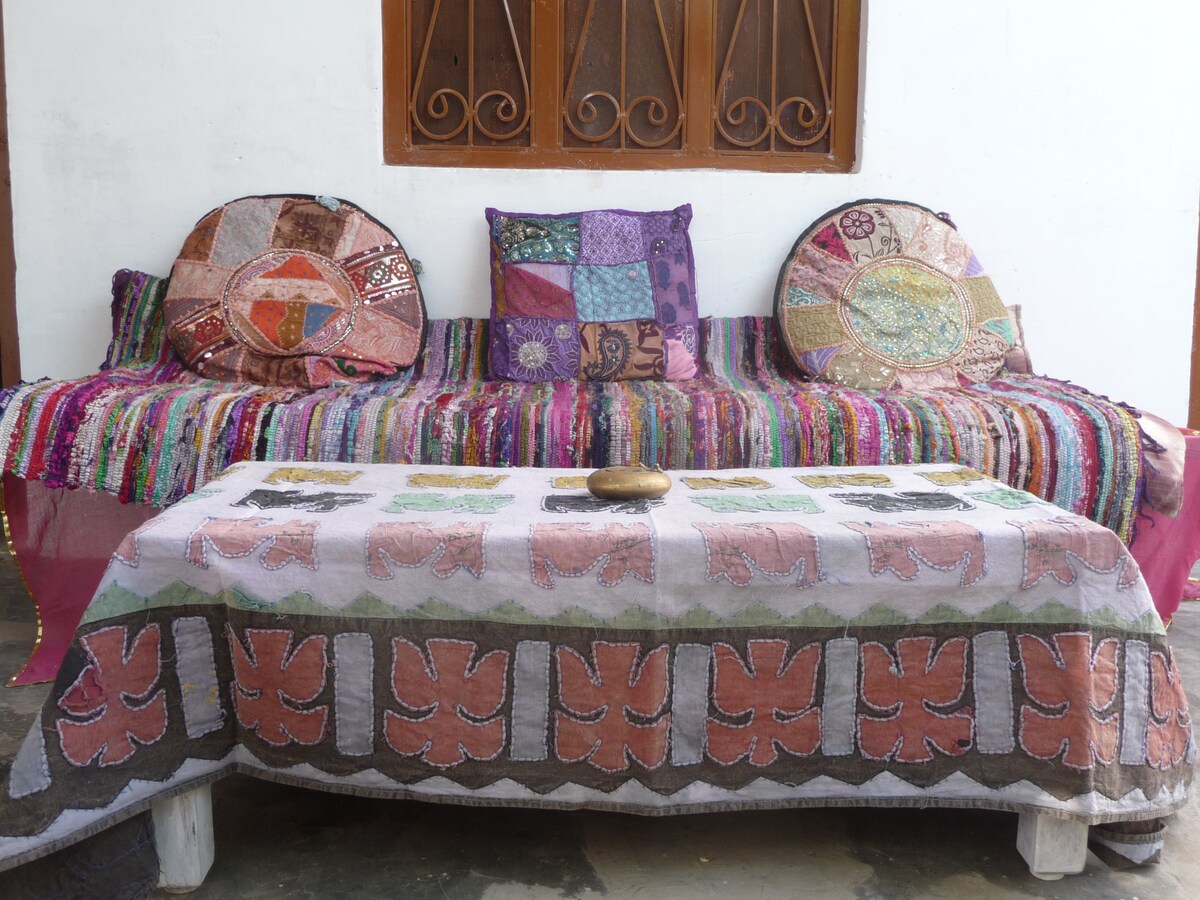 A real gem hidden in the middle of rose fields few meters away from the rush of Pushkar town. A home run by an Indian Israeli family adjacent to there 15 years old known restaurant A BLUE STAR. The space comes with a well equipped kitchen with all amenities and beautiful open balcony in the room. Our home is a perfect place to stay, if you are looking for nature, peace and serenity combined with great food from our restaurant.