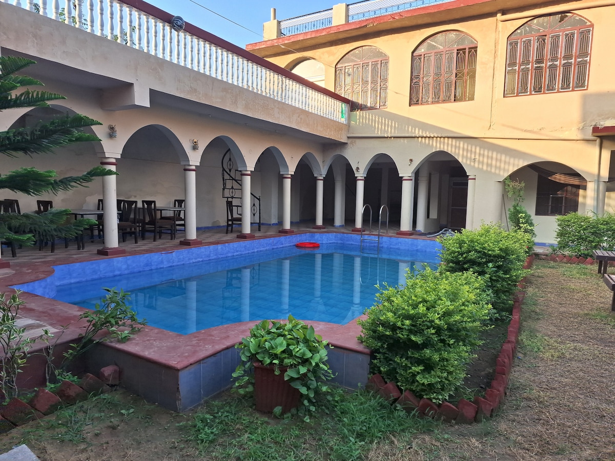Our property has 8 rooms. All rooms have attached bathroom. There is a garden in front of all the rooms. The property also has a swimming pool. We also get breakfast lunch and dinner on it. Entire room is air condition. There are mountain views all around the property. It is like a picnic spot. The property has a family like atmosphere.