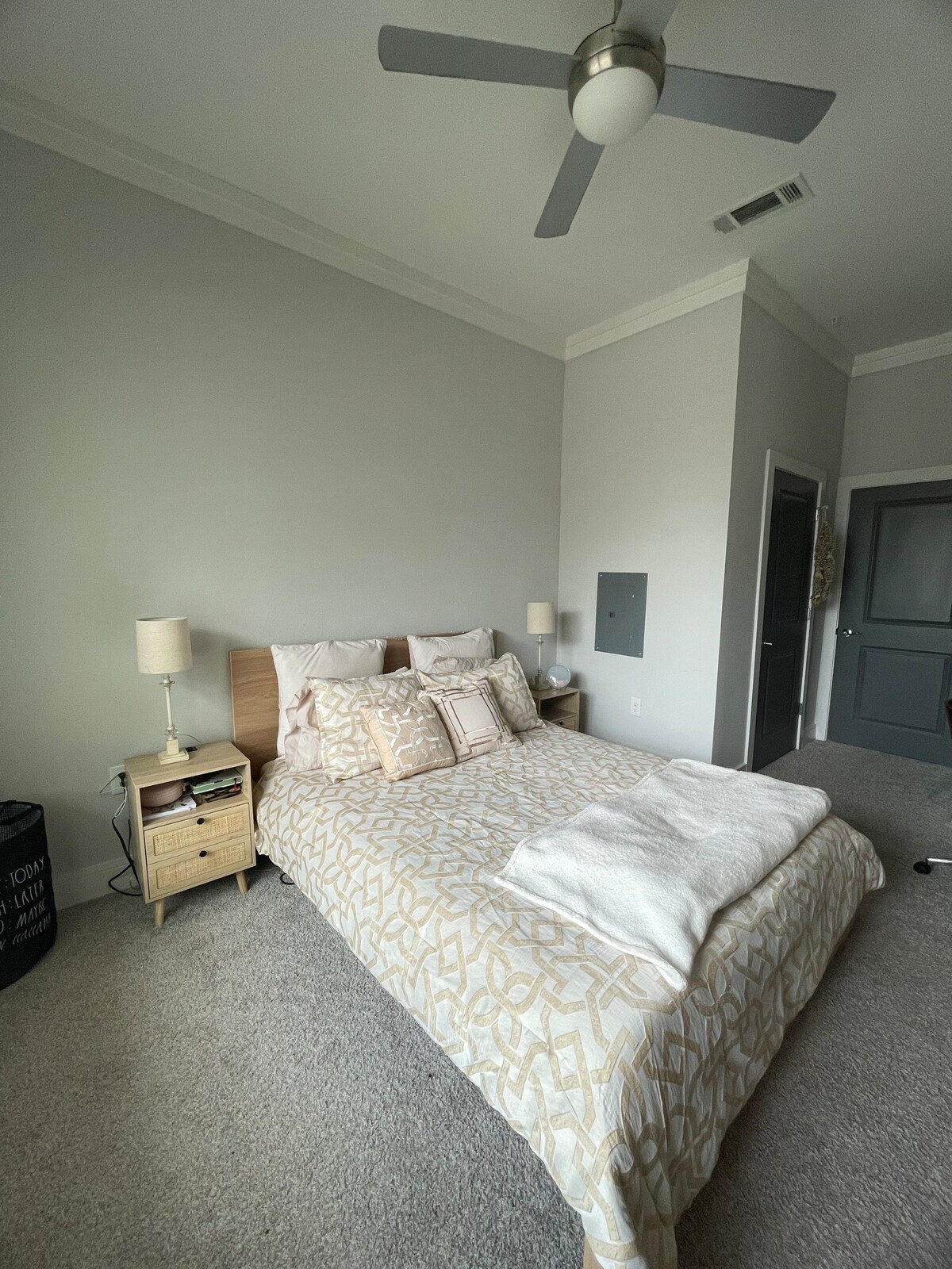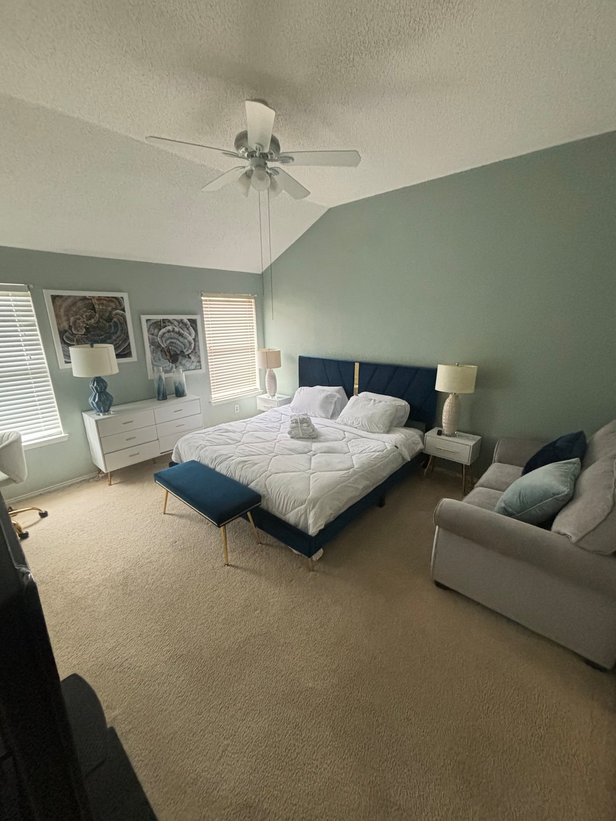 Two bedrooms available (separate listings) Green room or Tan room. Tan room is larger. 11.5 ft. x 17 ft. Double closets, remote ceiling fan, desk,Wi-Fi, FIOS, TV. double window with mini blinds and room darkening curtains too.