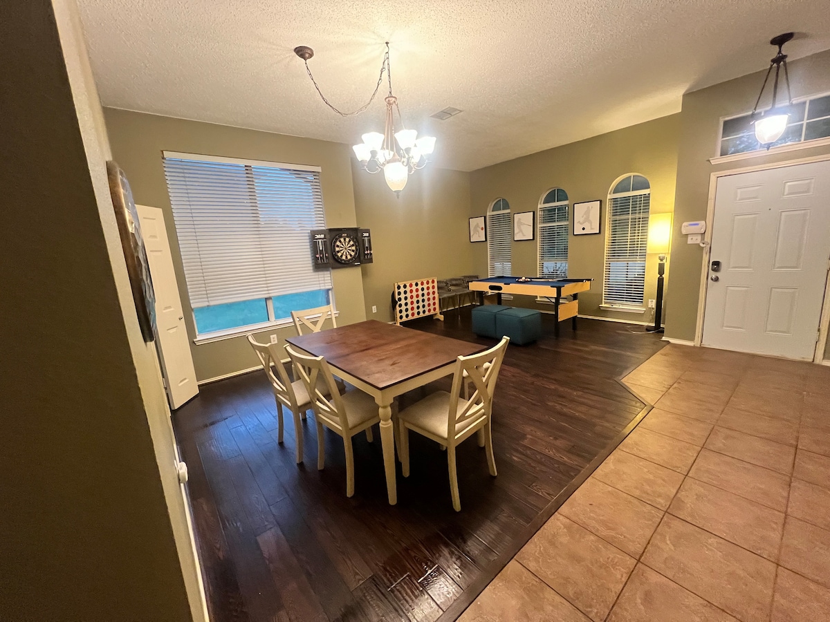 Large 4102 Sq.ft spacious floor plan with 5 bedrooms and 3.5 Bathrooms and lots of sleeping areas! NOTE: Home has 9 actual beds, 4 rollaway beds, 1 pullout sofa bed in gameroom, and 4 comfortable leather couches one can sleep on which totals to 19 sleeping areas.