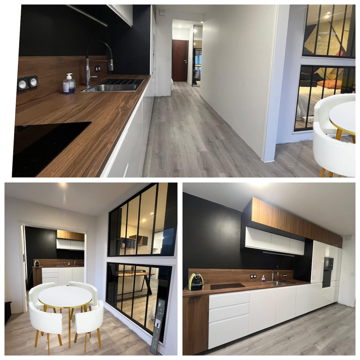- a kitchen (with oven, dishwasher, induction stove) separated from the living room by a canopy,