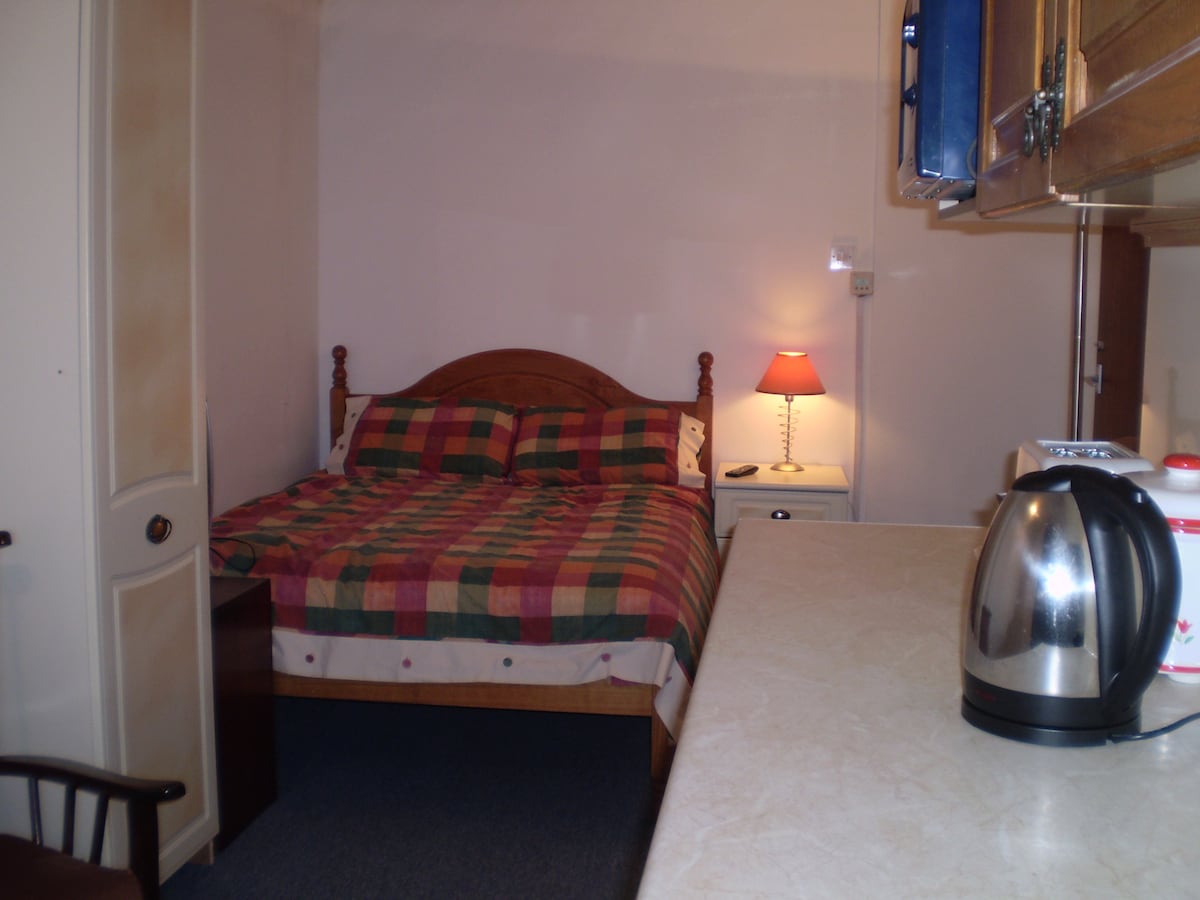 A cosy compact room, part of a building conversion, with more than the average utilities. Has private entrance, en suite, double bed, 2 seat sofa, fridge, washing machine, microwave, sandwhich maker, sink for dishes and worktop. Freeview TV and internet. Guest controls heating via thermostat in room. Large parking area More advantages than a hotel room. Ideal for a traveller.