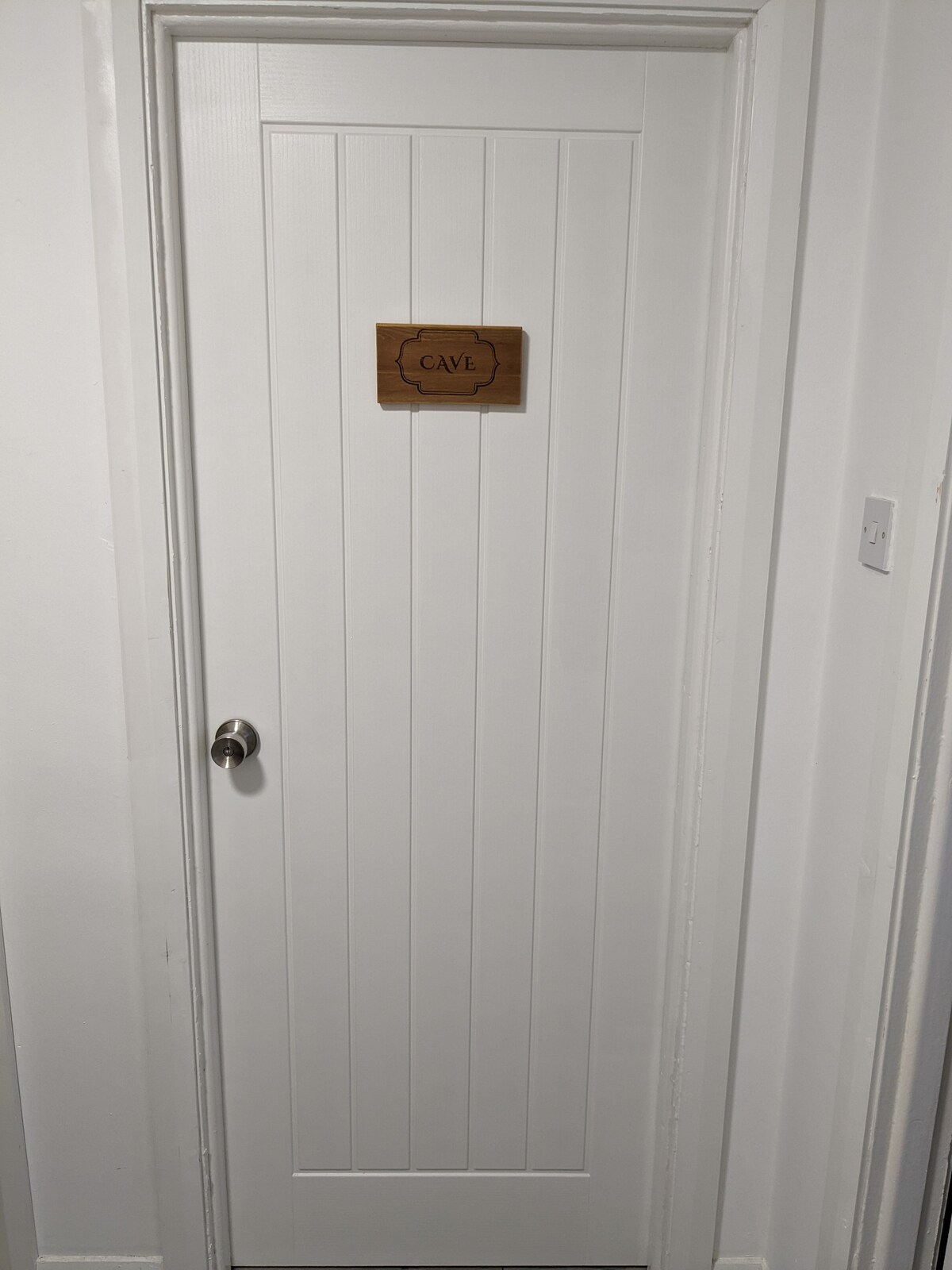 As you enter the house, go straight up the stairs. The room is on the 1st floor, to the left of the bathroom. There is a sign on the door called 'Cave'.