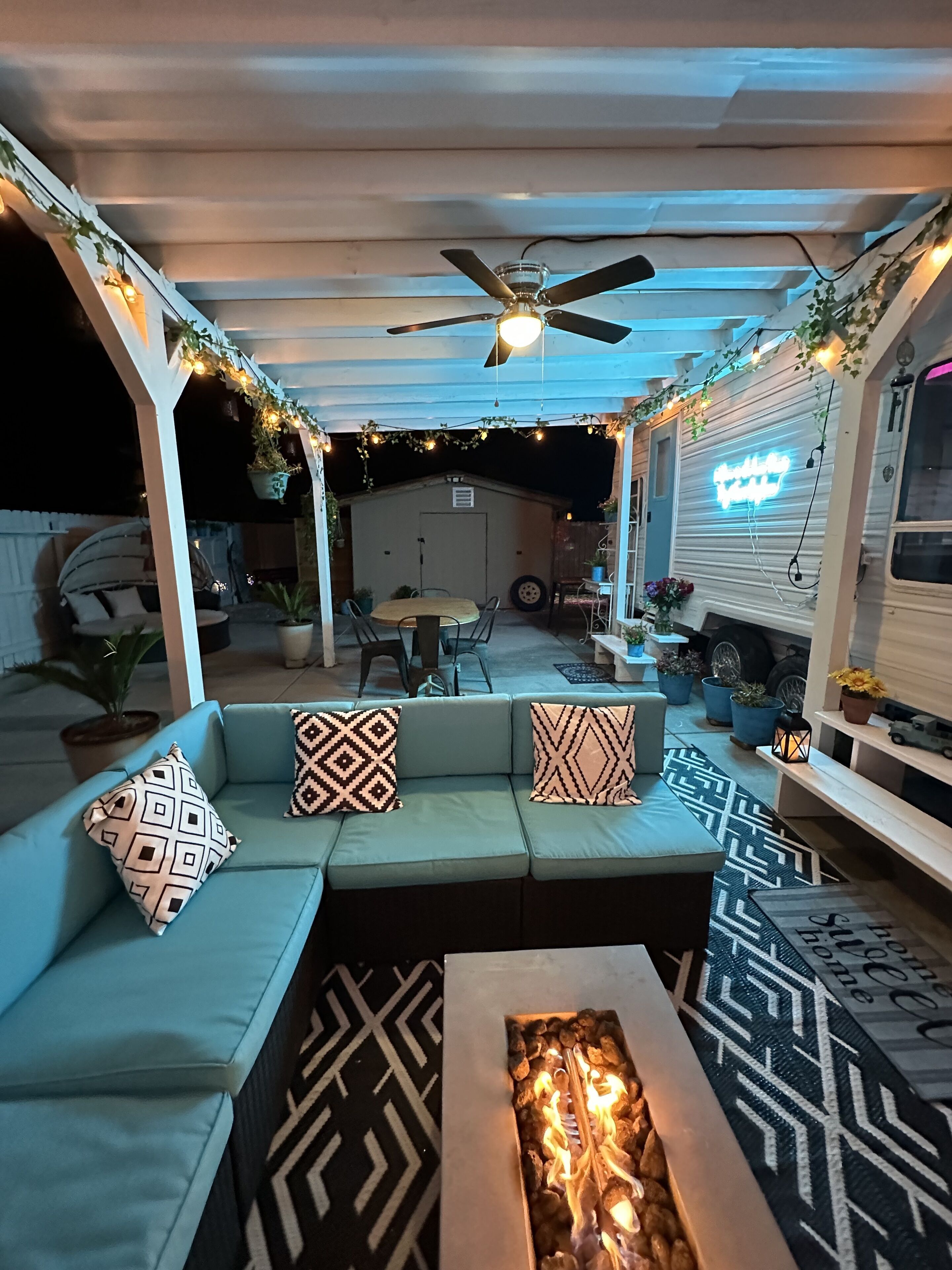 Despite the railroad, the gold rush and the dance halls and taverns arriving in the neighboring areas, Apple Valley remained a landscape of scattered homes and apple orchards. What is left now is the clean air among the colorful sycamores and the evergreen Joshua trees. Picture yourself here, in this fully equipped RV, complemented by an outdoor living room and dining room, a fully contained sauna and jacuzzi, and all the free space within the premises of a white picket fence, where you or your children can safely play outdoors until the wee hours.