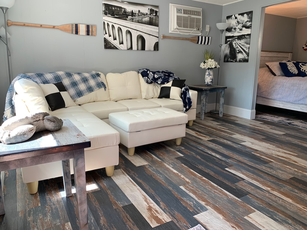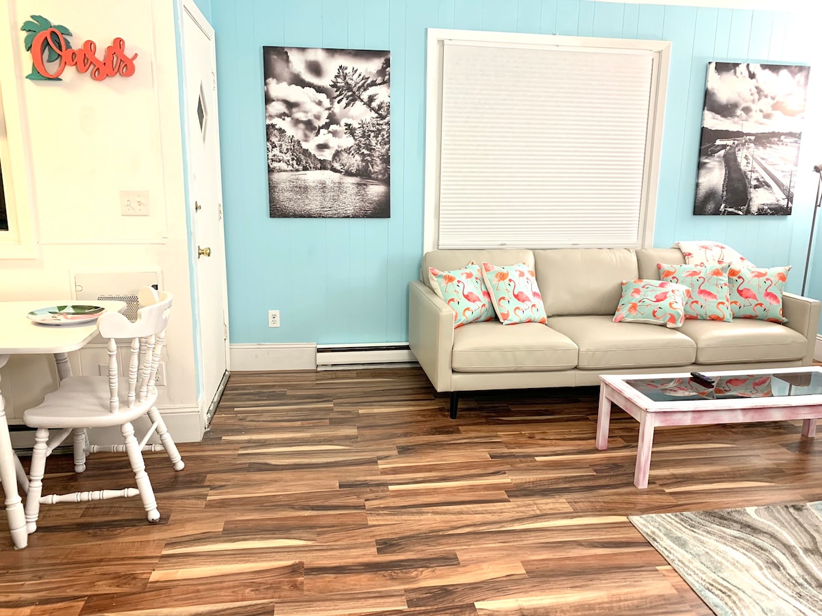 1. Living Room: Cozy up in our living room with a comfortable sofa that features a 55" HD Roku TV perfect for movie time!