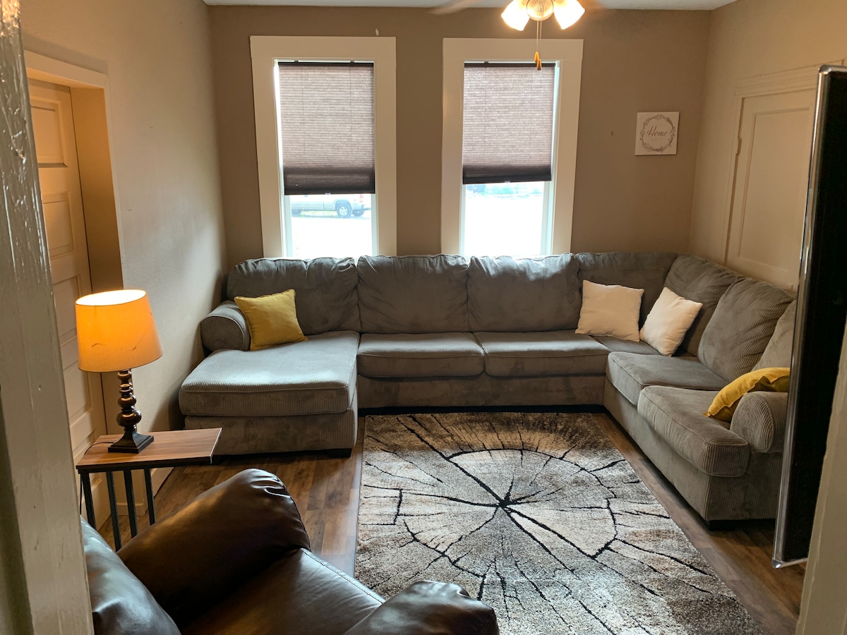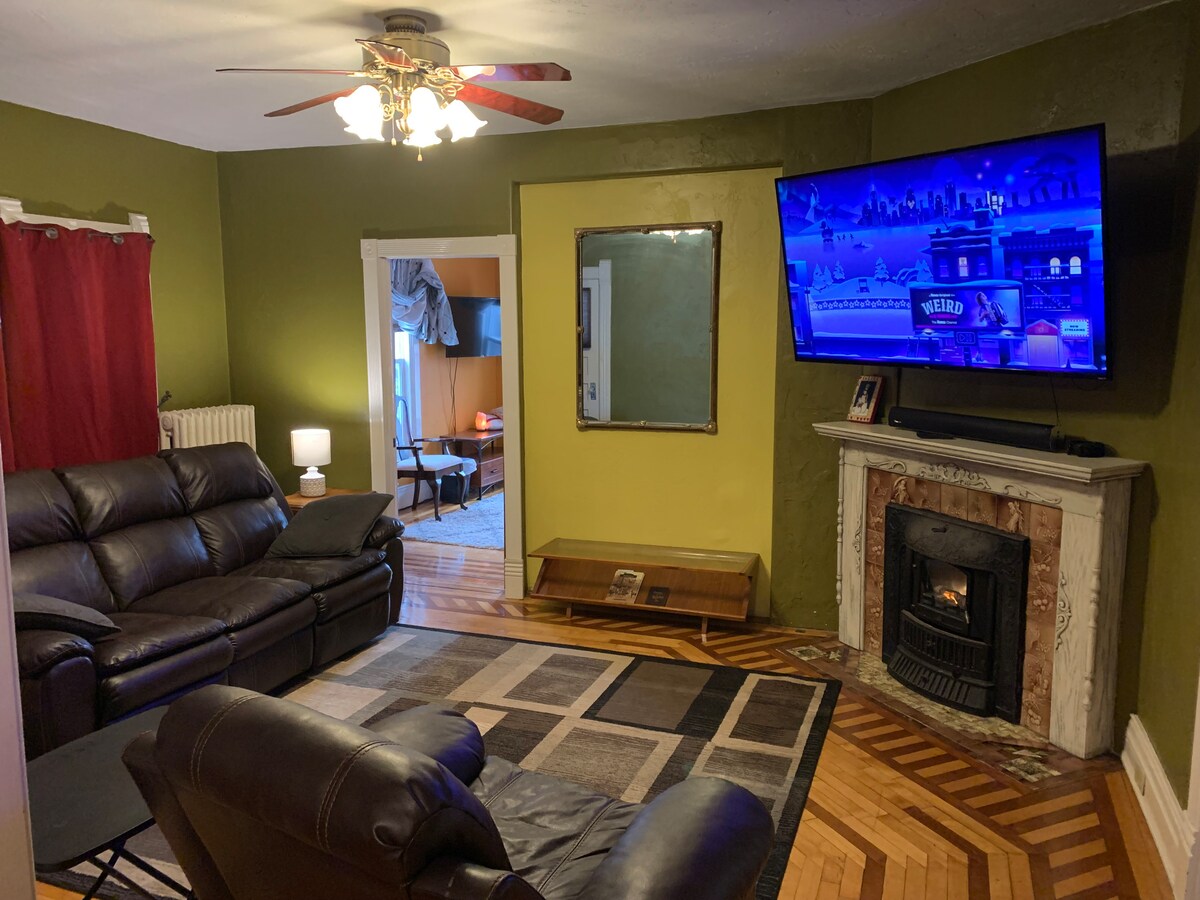 Large living room and expansive dedicated work space. Very appropriate for having business in front entry area for our guests who may work some shifts at home. Historic home has hardwood floors and high ceilings.