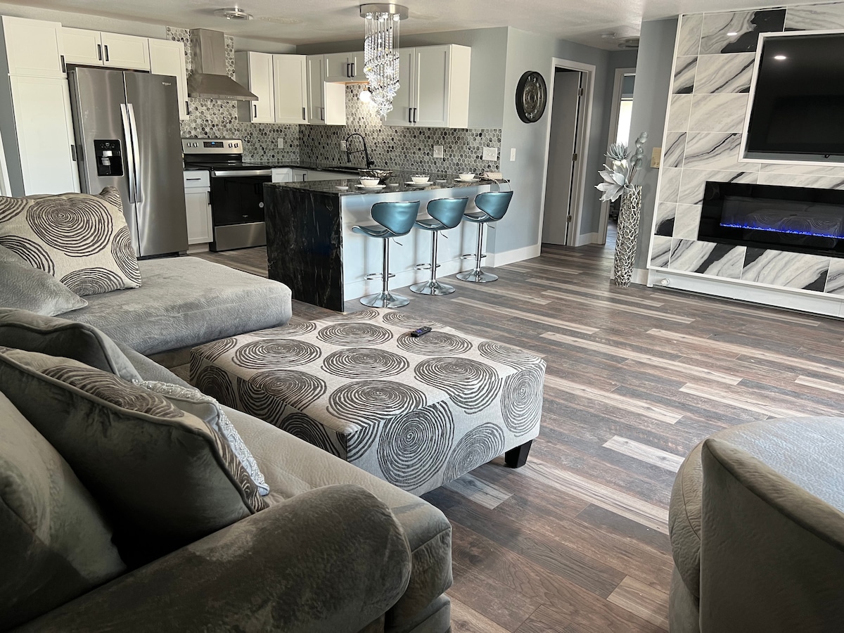 Waterfall granite countertops, exquisite backsplash, new cabinetry, and a huge fireplace and entertainment center.
