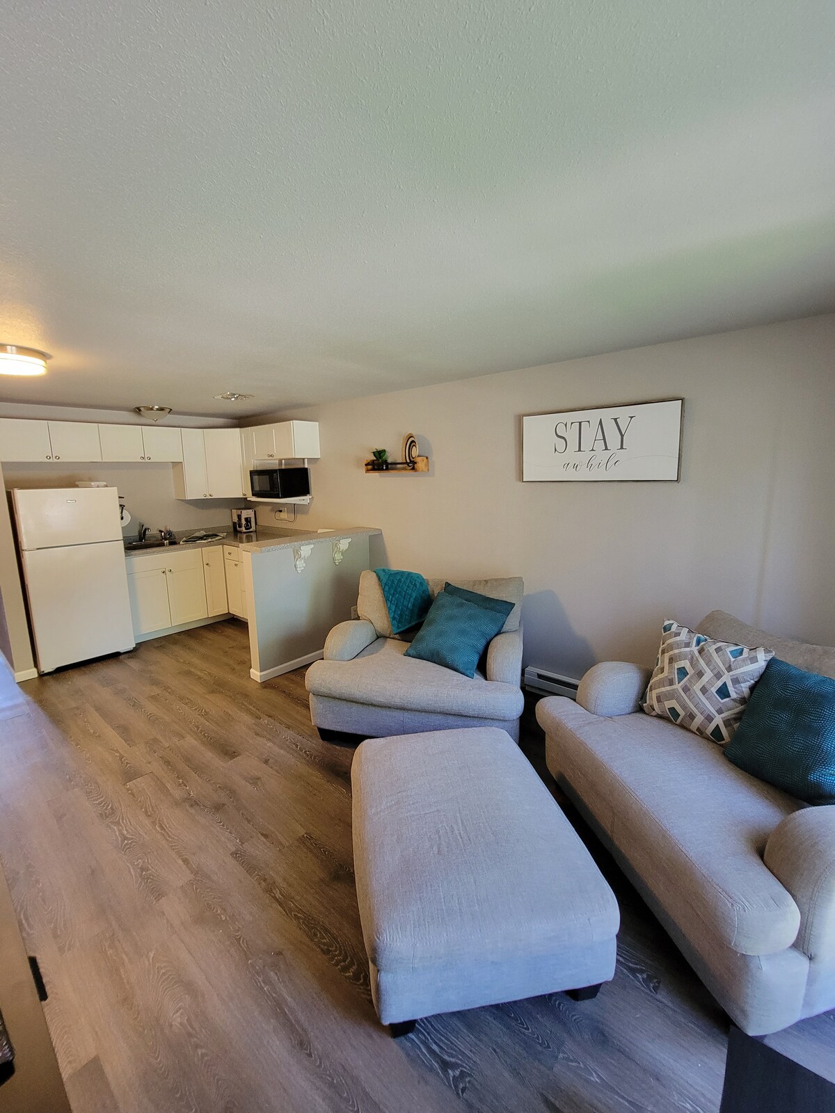 The Yacht Club has a fun, fresh design with every amenity a traveler needs to be comfortable for a long-term stay. Toasty electric fireplace in the winter and AC in the summer, drive in garage access, king bed, cognac hardwood flooring, and modern granite counters and cool tile in kitchen. Yes to dishwasher, fridge, stove and in unit laundry. No steps. Yes to pets. Plenty of privacy and quiet.